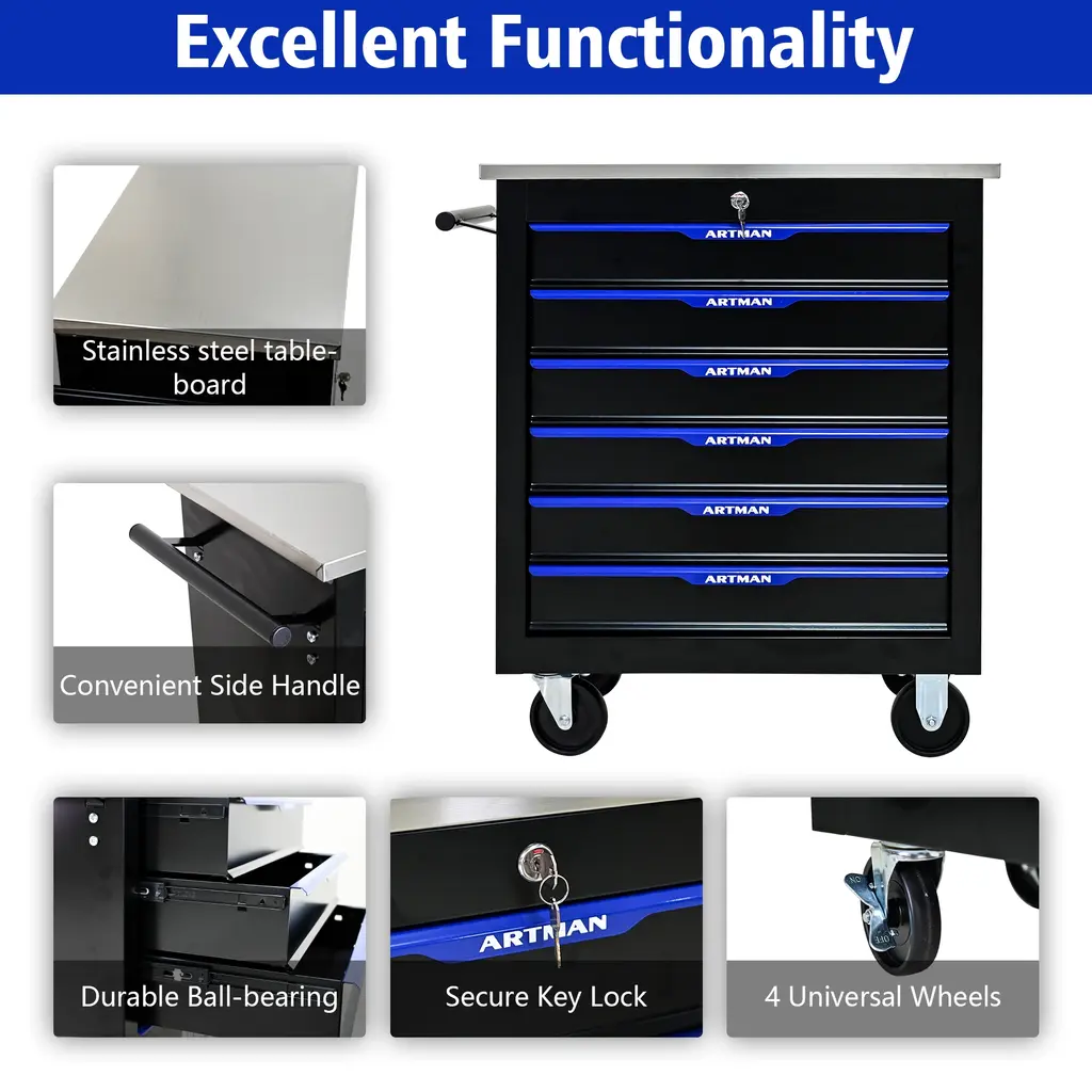 Versatile 6-Drawer Tool Cart With Smooth Mobility And Secure Locking - Blue