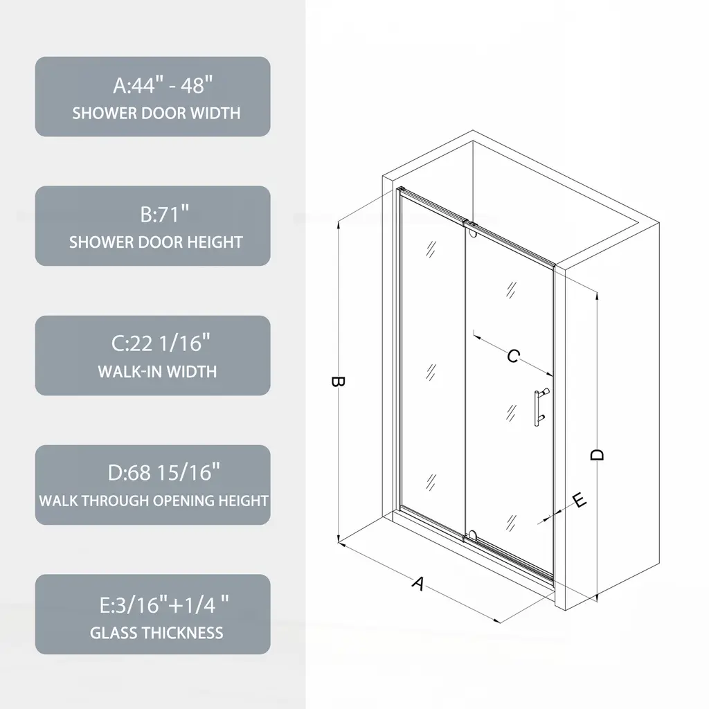 Product FeaturesWide Compatibility: Our shower door covers a 4" size range, making it a perfect fit for widths between 44" and 48". It's designed to accommodate various bathroom spaces, offering you flexibility in installation.Versatile Opening: This shower door is both left and right universal. Whether your bathroom layout requires a left - hand or right - hand opening, it can easily adapt to your needs. And the easy - install system means you can have it up and running in no time.Premium Hardware: Featuring a stainless steel handle and hardware, it not only adds a touch of elegance but also ensures long - lasting durability. The 6" stainless steel handle provides a comfortable grip.Superior Sealing: With magnetic close technology and a top - notch anti - leakage design, you can enjoy a splash - free shower experience. Water stays inside the shower area, keeping your bathroom floor dry.Adjustable Channel: The wall adjustable channel of 3/8" allows for fine - tuning during installation, ensuring a perfect fit against your bathroom walls.DescriptionOur Piovt Swing Glass Shower Door offers a sleek and functional solution for your bathroom. It can open either left or right, giving you the freedom to choose according to your bathroom layout.