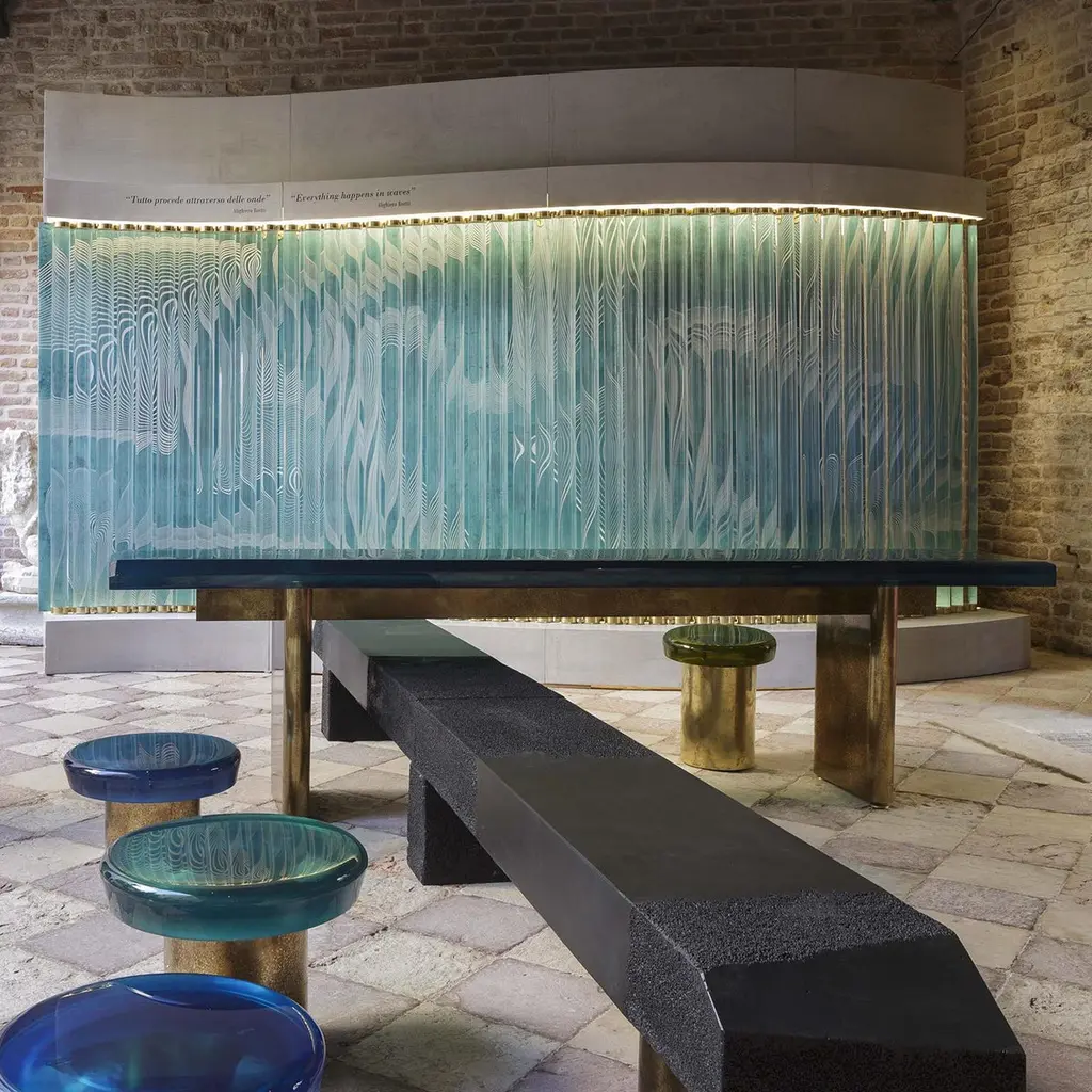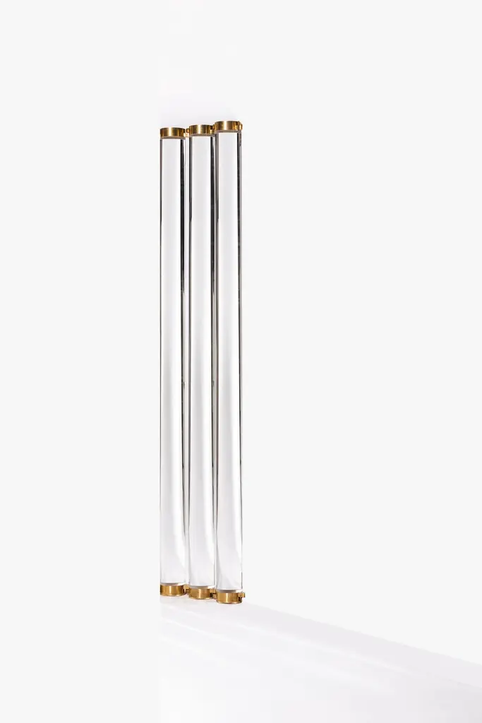 Conceived as a modular room divider, Vertigo is an undulating multi-compositionof cylindrical lucite bars hooked through brass latches. By rotating the interlocking elements, the arrangement forms a wave, conveying a sense of movement. This dynamism is further accentuated by positioning hand-painted fabrics — crafted in our atelier — behind the colorless resin rods; their interaction with the underlying graphics generates blurred and twisted optical effects.SIZE: L 33, W 10, H 160 Ø 10The price listed is for a set of 12 pieces.