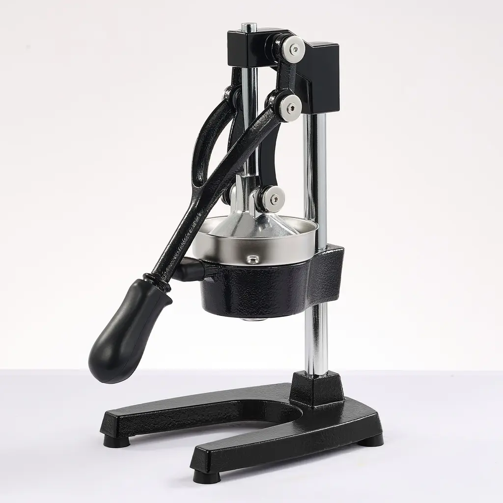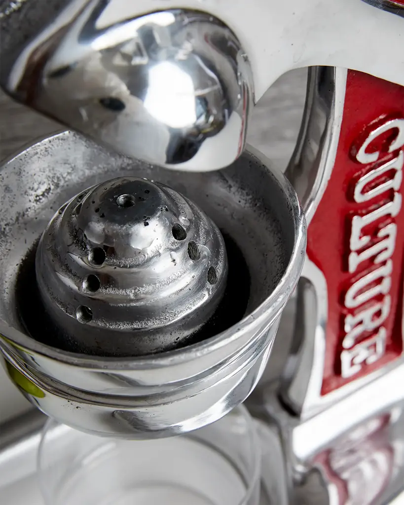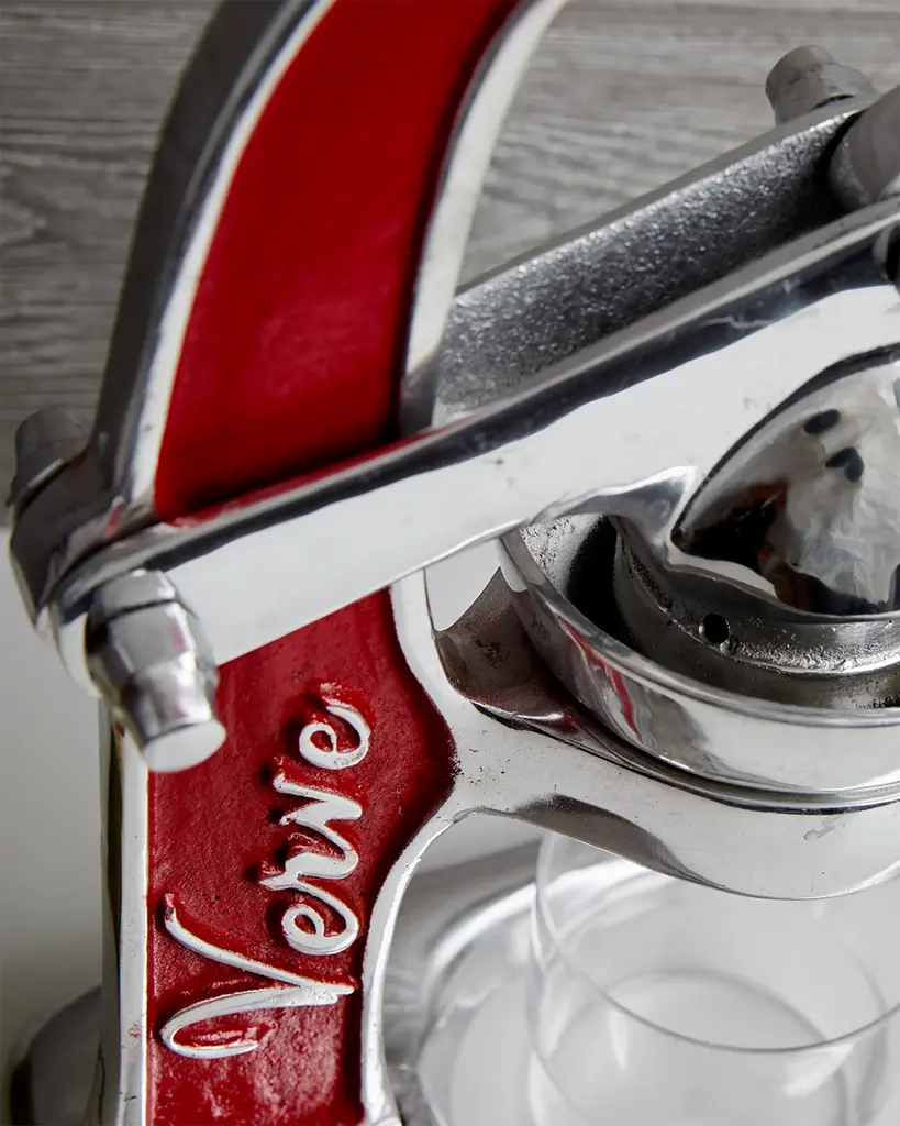 Handcrafted manual juicer perfect for lemons, limes, and small oranges. Recycled aluminum. Hand wash removable pieces. Spot clean base. Approx. 14"L x 5.7"W x 13.5"T. Made in Mexico. undefined