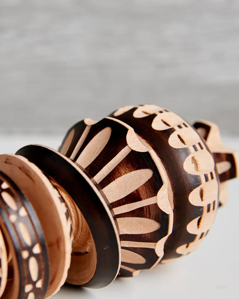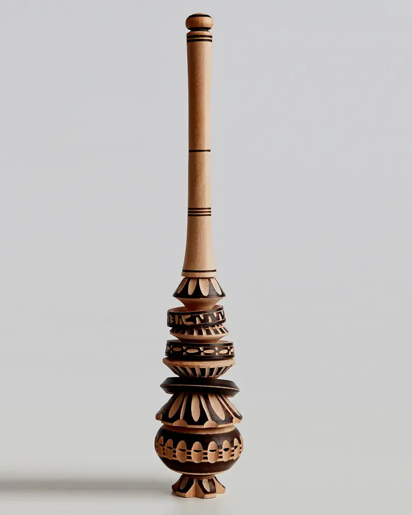 The molinillo is a Mexican wooden whisk that's used to mix up and add froth to a batch of Mexican hot chocolate. You simply roll the shaft between your palms to churn, mix, and foam the chocolate. The molinillo is also great for muddling fruits and herbs in homemade cocktails! It's a pleasure to use, or gift – and it's a guaranteed attention-grabber. Each molinillo is made by hand – turned and carved out of a single piece of alder wood; then decorated with dark accents burned into the wood. Each of our molinillo artisans have a deep history with woodworking – some spending nearly 50 years making molinillos. It's a craft that is shared and passed on to keep these rich, intricate pieces alive. Handmade. Alder wood. Hand wash. Approx. 2.5"Dia. x 13"L. Made in Mexico. undefined