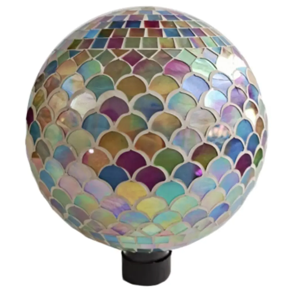 Bring vibrant elegance to your space with this handcrafted 10-inch mosaic glass gazing globe, featuring a triangle multicolor tile design that beautifully reflects light in every direction. Made from premium-quality glass, it offers vibrant color, intricate detail, and lasting brilliance. Versatile in display, it can be hung from a porch, patio, or garden hook using the included chain, or placed in a stand, flower bed, or tabletop arrangement. A stemmed bottom with a protective rubber cap ensures a secure fit in most standard gazing ball stands (stand not included). Ideal for gardens, balconies, courtyards, entryways, or indoor décor, this artistic globe adds a whimsical and elegant touch to any setting. It also makes a thoughtful gift for garden enthusiasts, nature lovers, and décor collectors, perfect for birthdays, housewarmings, Mother's Day, and more.