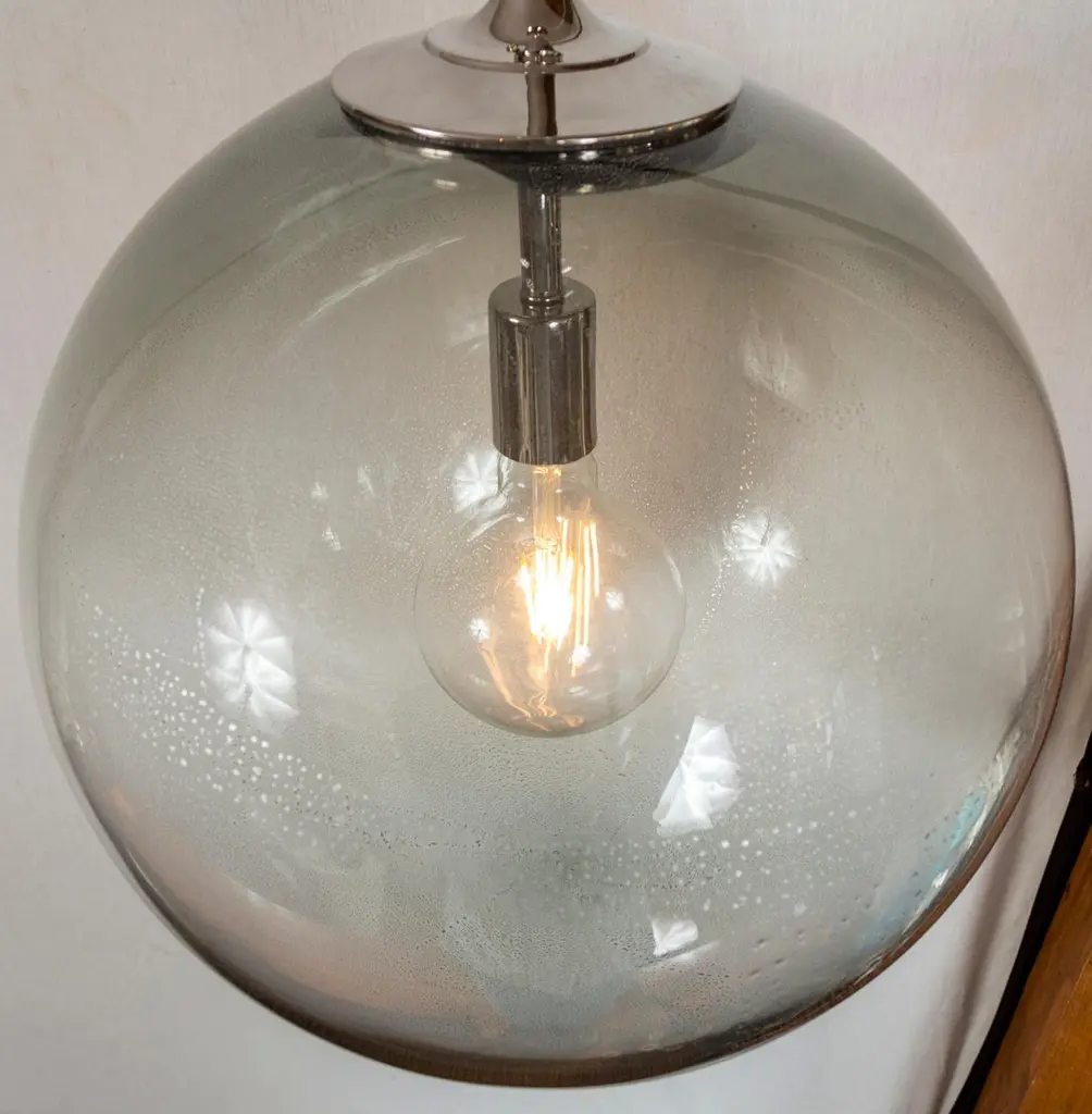 A wonderful pair of very large mouth blown globe shaped pendants in a light gray with silver. The silver offers a subtle texture with speckling and light overall shimmery quality upon illumination. Each globe while the same color are unique in its silver distribution.The frame is fabricated to your desired overall height and finish. The frame is custom fabricated in the US and shown in a polished nickel finish on brass. Sold as install ready and UL certified.Dating: Contemporary, Limited Edition, commissioned by L'AntiquaireOrigin: Murano, ItalyDimensions Glass 18" diameter, OAH shown 36"Condition: Very GoodWeight: approx 30lbs, the glass is heavy and blown thicklyPriced As a pair.