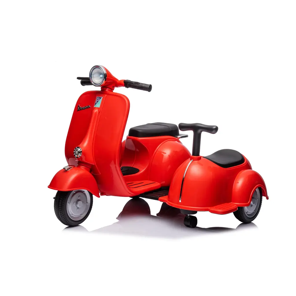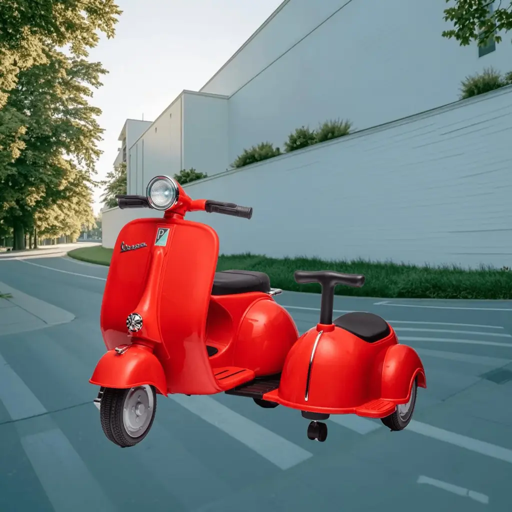 Overview: The 6V Licensed Vespa Scooter with Sidecar is the perfect ride-on toy for young riders who are ready to experience the thrill of cruising like never before. Designed for children aged 3 and up, this electric scooter combines a classic Vespa look with modern features to provide an unforgettable driving experience. The scooter comes with a sidecar, allowing two children to ride together and enjoy the fun, while the bright headlights and functional music board enhance the realism of the experience. Key Features: