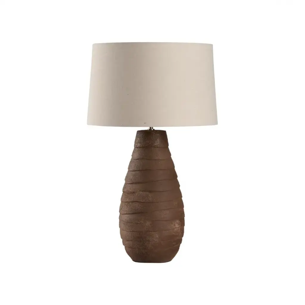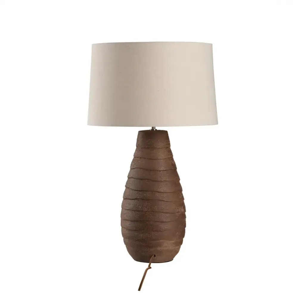 The Vespucci Lamp brings natural texture and timeless craftsmanship to your space. Made in Italy from ceramic, its ridged, organic form is finished in a rich, earthy tone with a raw, tactile surface that adds depth and warmth. Paired with a simple linen drum shade, this lamp is a grounded, versatile accent for any space.