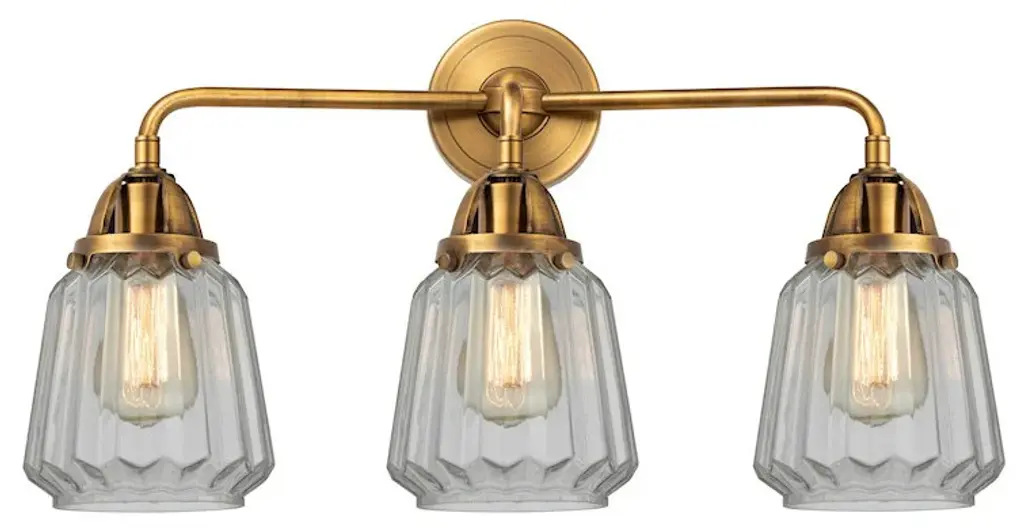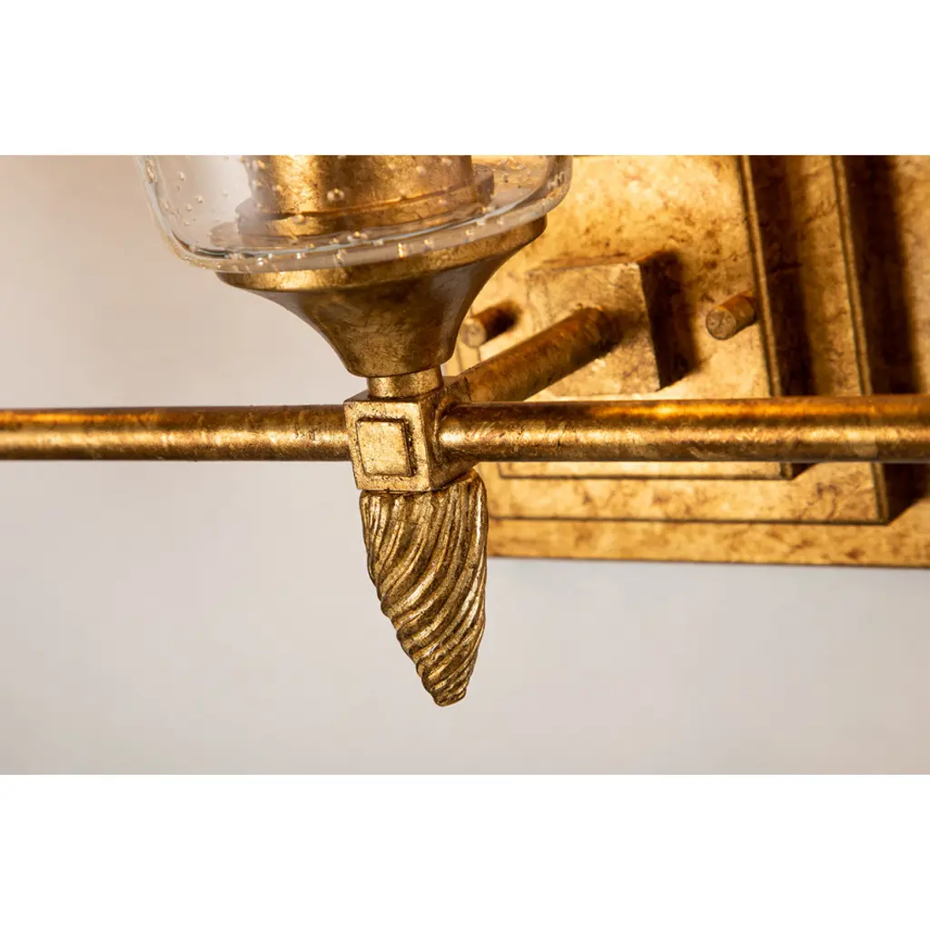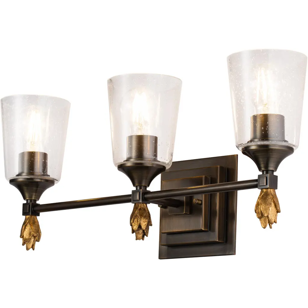 Inspired by 1950s and 60s design, the antique gold finish and double square backplate of our Vetiver 3-Light vanity light adds charming style to your bathroom space. The simple clear seeded glass, beautifully detailed finial, and the elegant torch-like shape complete the look of this new three-light bathroom lighting fixture.