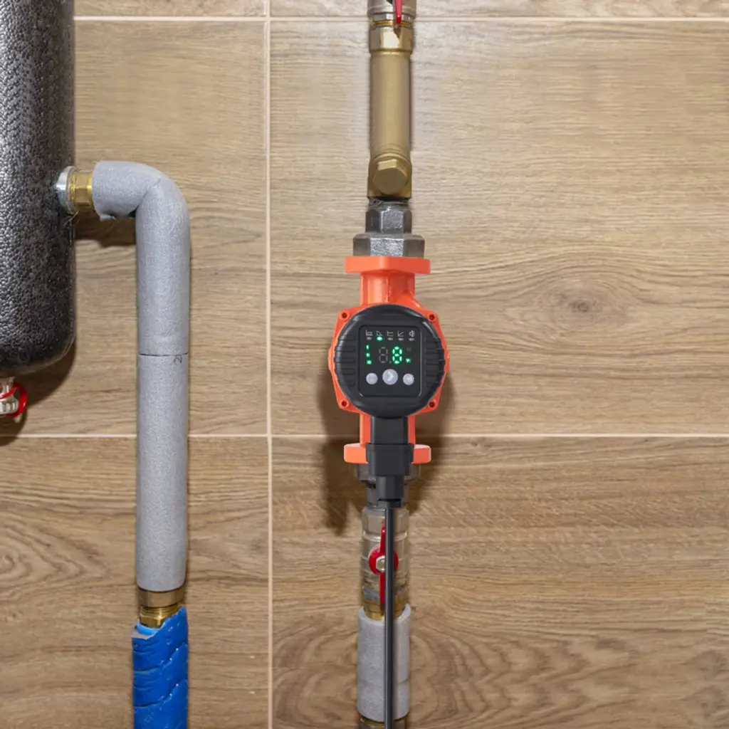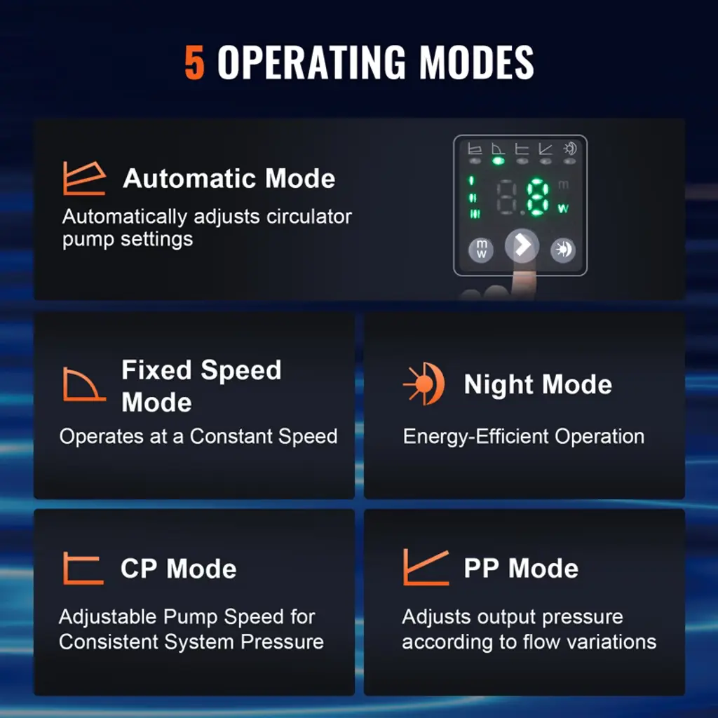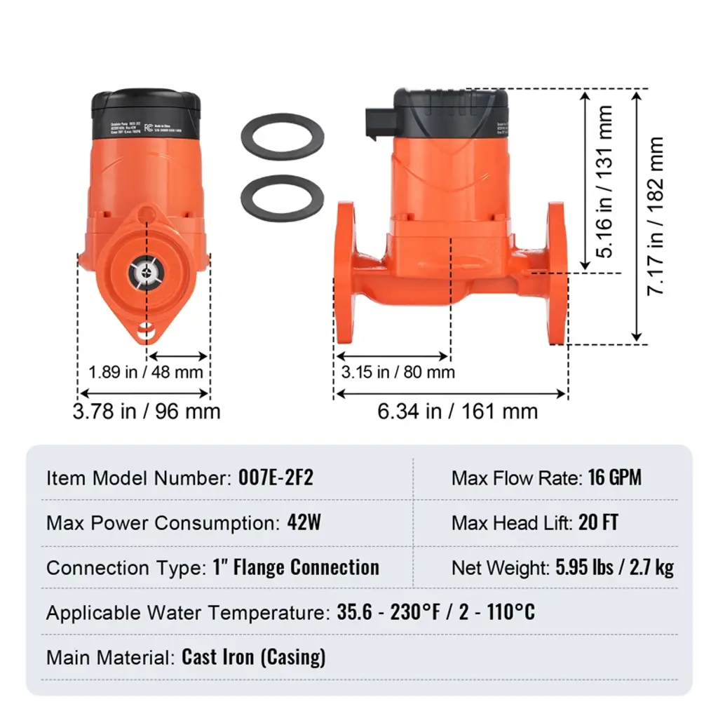 Feature: High-Performance & Energy-Efficient: Replacement Part Number: 007E-2F2. Featuring an ECM permanent magnet motor, our high efficiency circulator pump reduces energy loss with advanced electronic commutation technology. With a maximum flow rate of 16 GPM and a head of up to 20 ft, it seamlessly replaces your existing pump while cutting energy cost and boosting heating efficiency. Intelligent Control Modes: Equipped with five smart control modes—Automatic, Constant Speed, Constant Pressure, Proportional Pressure, and Night Mode—this cast iron circulator pump automatically adjusts its operation based on your needs. Optimize your heating system's performance, enhance comfort, and reduce energy consumption with tailored settings. Built-In Check Valve: Designed to ensure water flows in the correct direction, our check valve avoids backflow, maintaining system stability and extending the pump's lifespan. Our hot water circulation pump minimizes maintenance and replacement needs, keeping your system running smoothly. Low Noise Operation: Equipped with a copper core permanent magnet motor, our hot water recirculating pump operates with minimal noise, reaching no more than 45 dB. With no brushes or slip rings, it reduces mechanical wear and maintains a peaceful home environment, even near your underfloor heating areas. Durable Construction: Made with a robust cast iron housing, this high efficiency circulator pump is designed to handle water temperatures from 35.6 to 230°F, ensuring reliable performance across various conditions. The high-quality materials and design provide a long-lasting, low-maintenance heating solution. Package Content 1 x Circulator Pump 2 x Sealing Rings 1 x Check Valve (built-in) 1 x Instruction Manual