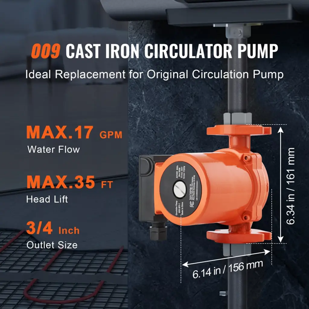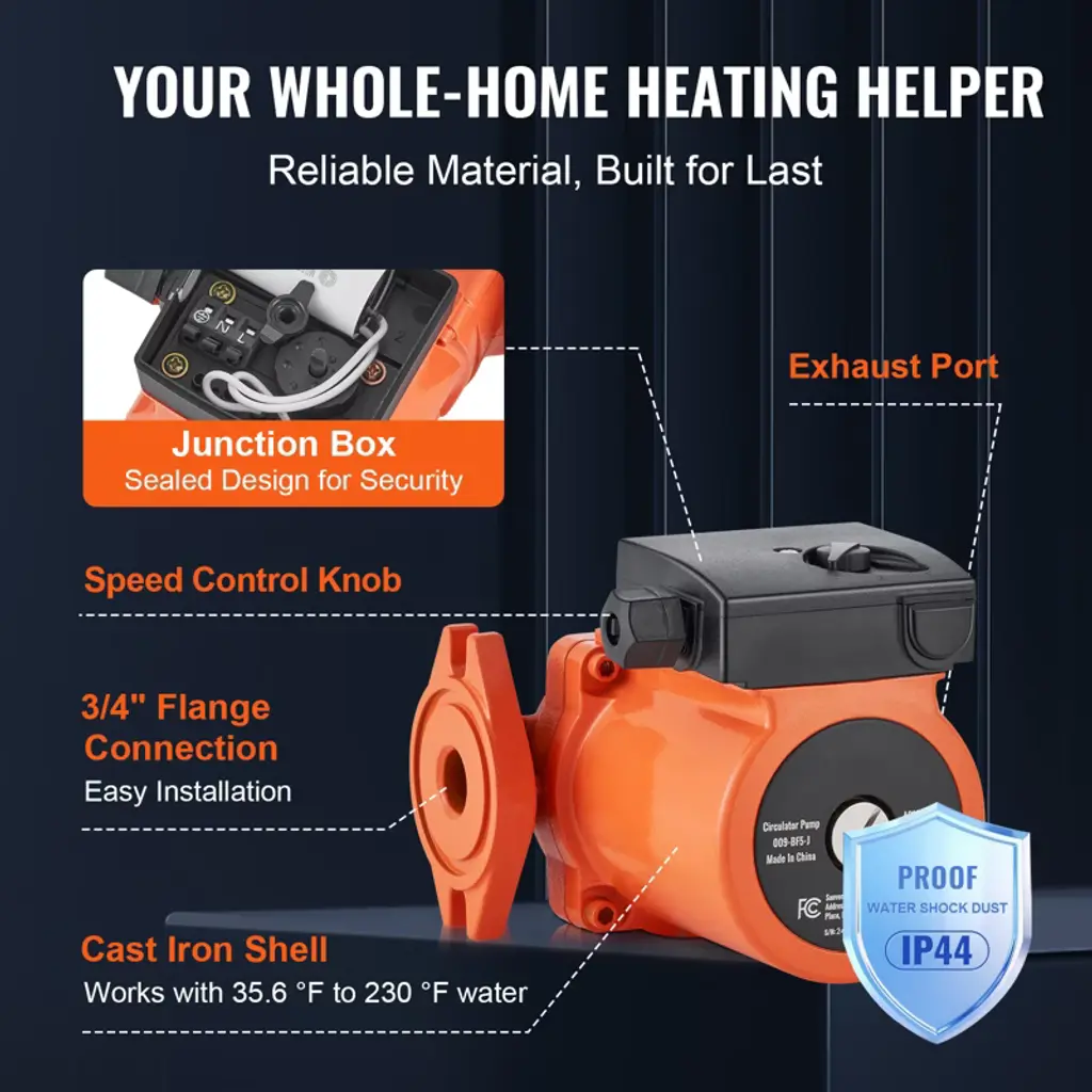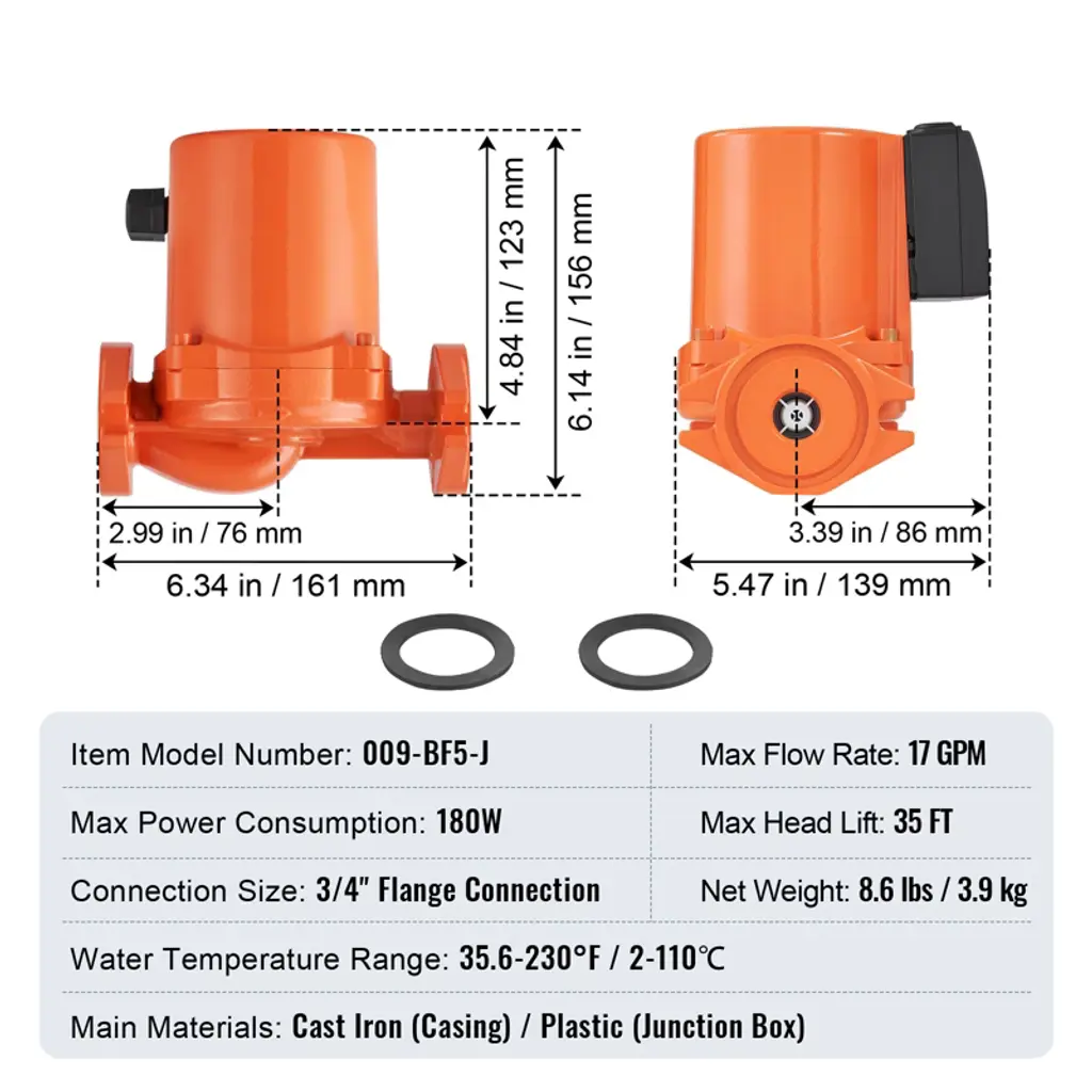 Feature: High Compatibility Design: Replacement part number: 009-BF5-J. Engineered specifically for underfloor heating systems, this cast iron circulator pump offers a maximum flow rate of 17 GPM and a head of 35 ft. With a 3/4" flange connection, it seamlessly replaces your existing hot water recirculating pump, meeting the circulation needs of both homes and complex piping networks with ease. Built-In Check Valve: Designed to ensure water flows in the correct direction, our check valve avoids backflow, maintaining system stability and extending the pump's lifespan. Our hot water circulation pump minimizes maintenance and replacement needs, keeping your system running smoothly. Low Noise Operation: Featuring a pure copper motor and unique internal design, our cast iron circulator pump operates at a maximum noise level of just 45 dB. Enjoy a peaceful home environment without disruptive noises, even in close proximity to your heating zones. Adjustable Flow Rate: With three adjustable speed settings, tailor the water circulation speed to your seasonal needs or specific usage requirements. Achieve greater energy efficiency and comfort with ease. Durable Construction: Built with a cast iron exterior and IP44 protection rating, our hot water recirculating pump withstands a wide temperature range (35.6°F to 230°F). The high-performance pure copper motor and fully sealed junction box ensure long-term stability and security for reliable operation. Package Content 1 x Circulator Pump 2 x Sealing Rings 1 x Check Valve (Built-in) 1 x User Manual