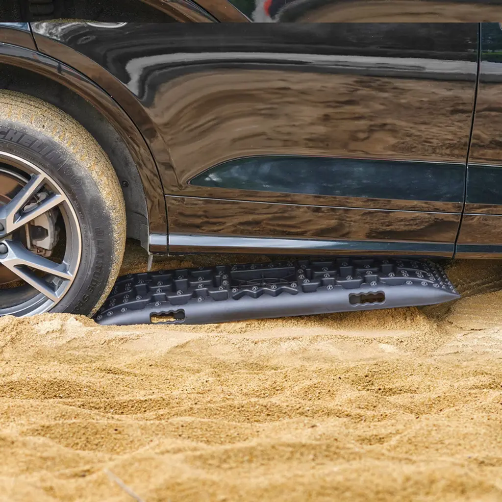 Feature: PP Material: The recovery boards are made from high-strength PP material, offering flexibility and high elasticity. It retains its shape and does not deform or break even after prolonged use. Its superior weather resistance makes it ideal for use in extreme temperatures, both low and high, ensuring durability and reusability. 10-Ton Load Capacity: With a maximum load capacity of up to 10 tons (22,046 lbs), the traction boards can support various vehicles, including SUVs, RVs, cars, and trucks. Even large vehicles can be quickly rescued with this board. Non-Slip Tooth Design: The surface features a cross-tooth and U-shaped groove design, ensuring full grip on the tires to prevent slipping or misalignment. The base includes a farm jack socket for added stability during recovery operations. Reliable & Sturdy: The recovery traction mats have sloped ends that can double as shovels to easily clear sand or snow from the tires. The sloped design facilitates tire engagement and traction. Equipped with two pull straps, it is easy to pick up and deploy. Simply place the board under the wheels and follow the instructions to help your vehicle escape from mud, sand, or snow. Versatile Uses: Easy to use, the tire traction allows for quick rescue operations in mud, sand, snow, and complex terrains. The recovery board and pull straps can be conveniently stored in the carrying bag for outdoor use, making it an essential tool for addressing emergency situations during outdoor adventures. Package Content 2 x Traction Boards 1 x Storage Bag 2 x Pull Straps 1 x Instruction Manual