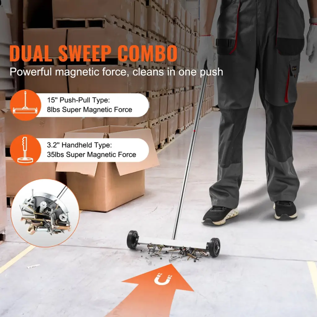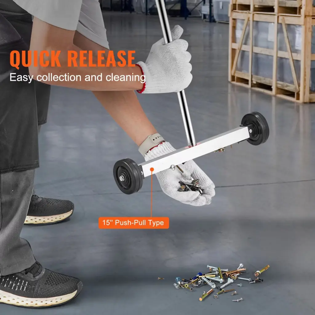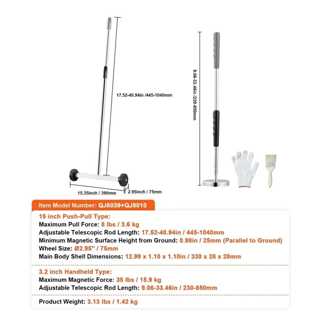 Feature: Superior Magnetic Power: The VEVOR magnetic sweeper with wheels includes a 15'' magnetic sweeper with wheels and a 3.2'' telescoping magnetic pickup tool, capable of holding up to 8 lbs (15'') and 35 lbs (3.2'') respectively. It effortlessly collects nails, screws, and black metal debris, protecting you from shards and sharp metals. Adjustable Heights: The telescoping handle allows for adjustable heights. The 15'' rolling magnetic sweeper adjusts from 17.52 to 40.94 inches (445-1040 mm), while the 3.2'' telescoping magnetic pickup tool adjusts from 9.06 to 33.46 inches (230-850 mm). Say goodbye to bending fatigue with convenient storage and easy portability. Ease of Use: The magnet sweeper features an ergonomic rubber handle for a comfortable and prolonged grip. Ø2.95-inch (75 mm) wheels effortlessly clean over gravel and grass surfaces. It includes a brush and gloves for easier use. Durable Construction: Crafted from high-quality materials including aluminum, plastic, magnets, and iron, the nail magnet sweeper withstands rigorous work environments. Featuring an aluminum alloy shell + A3 steel bottom, it's corrosion-resistant and includes an ergonomic rubber handle for comfortable, prolonged use. The anti-disassembly screw design ensures stability, while the Ø2.95-inch (75 mm) PP + rubber wheels provide durability and traction. Versatile Application: With a wide cleaning range, our magnetic nail sweeper efficiently covers large surfaces to swiftly clear entire areas. Ideal for picking up damaged nails, screws, and black metal waste, especially useful in shops, roofing projects, or post-automotive or mechanical repairs. Pro tip: After projects, clean floors, lawns, garages, and workshops to prevent injuries. Package Content 1 x Magnetic Sweeper 1 x Telescoping Magnetic Pickup Tool 1 x User Manual 1 x Brush 1 x Glove