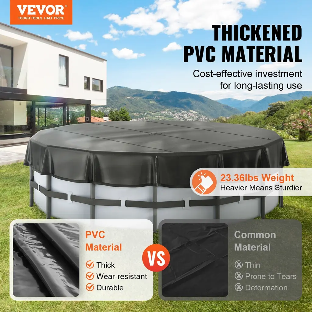 High-Quality Material: Our round pool cover is made from thick PVC and 420D Oxford fabric material, featuring premium stitching that's thicker and more durable. With a sun-proof coating, it's UV-resistant, providing max protection for your inflatable pool in harsh weather. Plus, it's foldable for easy storage.Keep Water Clean: Our 19ft and 16ft large pool cover effectively shields the 18ft and 15ft pool. Made from PVC coating and 420D Oxford fabric. The solar pool cover keeps it free from leaves and debris, keeping the water clean. Additionally, it reduces water evaporation by up to 90%, saving water resources.Solar Heating: Utilizing solar energy, this above-ground pool cover can heat your pool water, allowing you to warm it in advance without additional heating costs. It also helps maintain the water temperature, extending your swimming season and allowing you to enjoy a warm pool.Safety Assurance: Additional drainage holes in the middle of the winter pool cover prevent potential collapsing due to water accumulation. Enhanced with a 360° drawstring locking design, it prevents children and pets from accidentally falling into the pool, increasing the safety. It's easy to install and remove, allowing for quick usage.Versatile Application: Our safety pool cover is universally compatible and suitable for various scenarios, including round trampolines, round swimming pools, fountains, pet pools, and other outdoor furniture. You won't need to buy different covers for different equipment, saving you unnecessary expenses.Package Content1 x Pool Cover1 x Manual