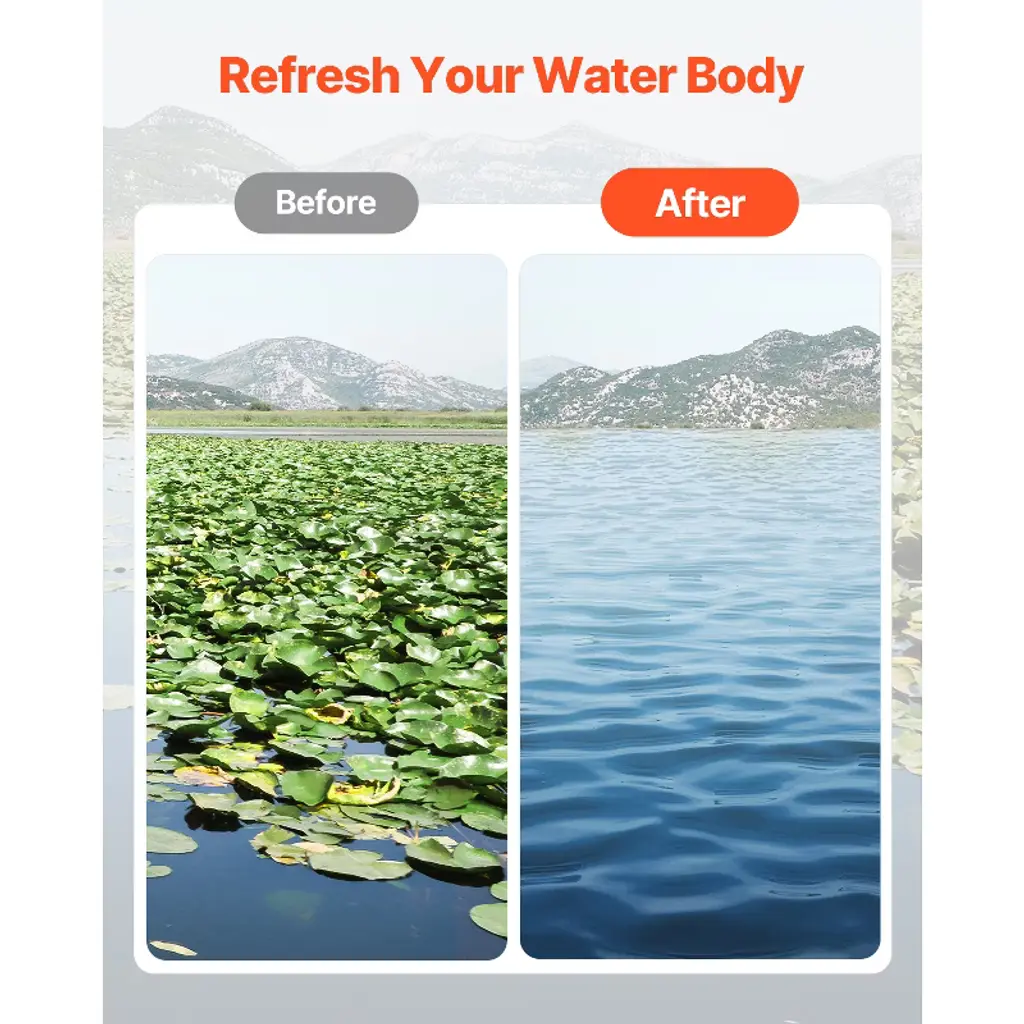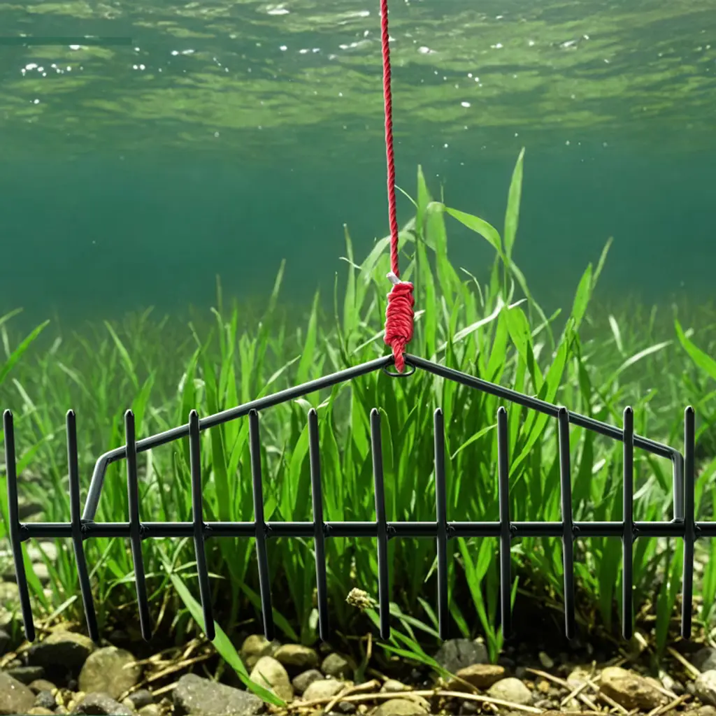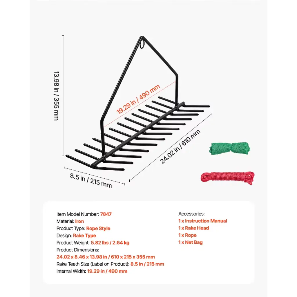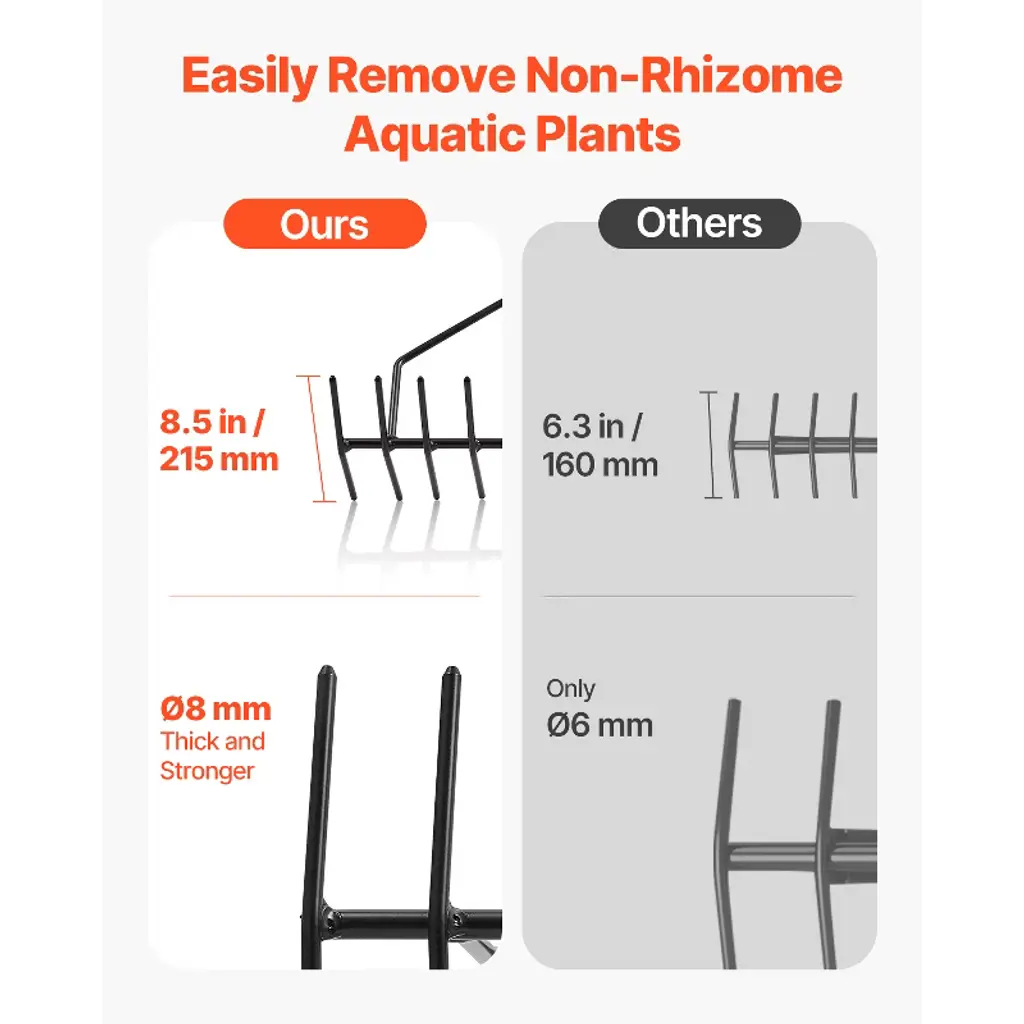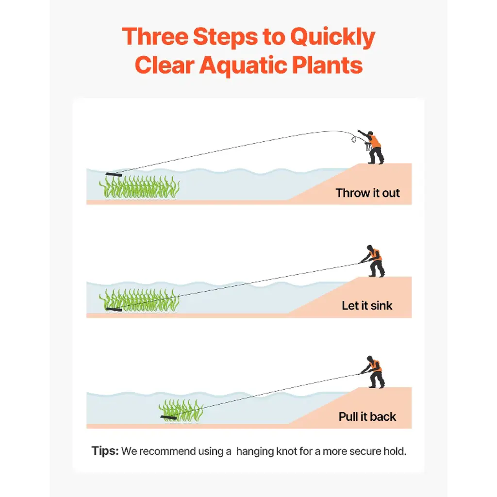 Feature: Efficiently Removing Aquatic Weed: The large 24 x 8.5-in rake head is designed to clear aquatic weeds in lakes, ponds, and rivers. The 8.5-in hook-shaped tines are longer and stronger than others, firmly gripping and removing weeds, keeping your waterway clear for water activities. Lightweight Operation: Weighing only 5.82 lbs / 2.64 kg, this aquatic weed rake comes with a 30ft (9m) nylon rope, allowing you to easily cover large areas. Simply throw the rake, let it sink, then reel it back to clear the weeds. It's easy to use, providing a hassle-free cleaning experience. High-Strength, Durable Material: Made from high-strength iron, this pond rake remains durable even with prolonged water use. The welded eyelet for the rope prevents the rope from shifting during use. The excellent welding craftsmanship enhances stability and safety, giving you peace of mind. Complete Accessories, Quick Assembly: This lake rake for weeds includes a 9-meter nylon rope and a net bag to help clear weeds in deeper waters and easily collect debris. The integrated design requires no assembly—simply take it out and start using it. Application Scenarios: This aquatic weed cutter is ideal for clearing aquatic weeds in lakes, ponds, and streams. Especially effective for non-rooted weeds like eurasian watermilfoil, chara, silk moss, coontail, and cotton moss. Tips: For tougher aquatic plants with thicker roots, we recommend using the ""aquatic rake with handle/lake weed cutter"" first, followed by the ""rope-style aquatic rake"" for better results. Avoid using the rake for beach weeding, as the salt in seawater may corrode the product and reduce its lifespan. Package Content 1 x Instruction Manual 1 x Rake Head 1 x Rope 1 x Net Bag
