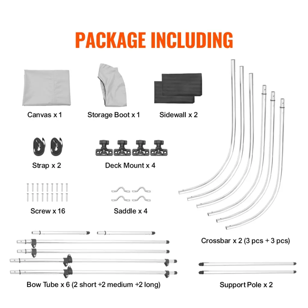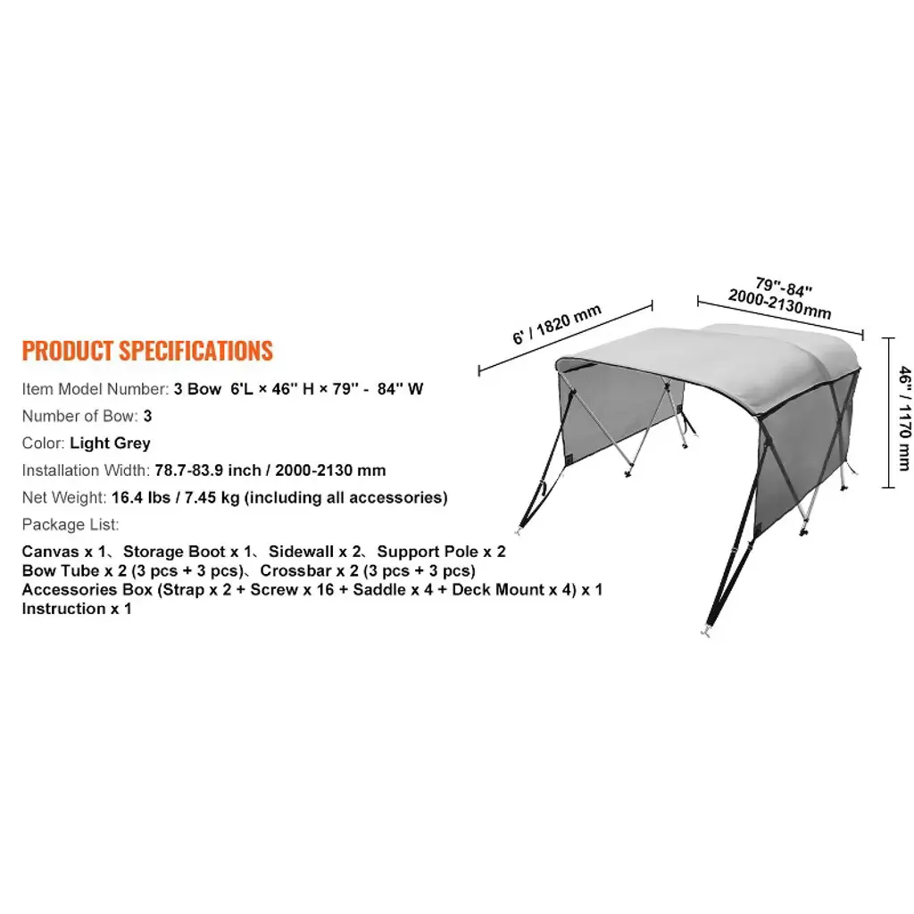 Feature: 600D Marine-Grade Polyester Canvas: Upgraded to heavy-duty 600D, our bimini tops for boat features UV50+ protection, waterproofing, and resists penetration. Enhanced with a quality dyeing process for colorfastness and double stitching for increased tear resistance. This boat bimini top is designed to withstand all weather conditions, providing a comfortable and cool boating experience. Detachable Mesh Sidewall: The bimini top canopy with mesh sidewalls for improved multi-directional sun protection, reducing direct sun exposure to skin and eyes. Additional shielding from wind and rain. The mesh design ensures better ventilation. Sidewalls are easily removable with zippers, providing a clear and bright surrounding view for smooth navigation. Rust-Resistant Aluminum Alloy Frame: The support poles are made from industrial-grade aluminum alloy with a 1.5 mm wall thickness and a 1-inch diameter, ensuring they are bend and break-resistant. This lightweight material of the bimini top cover also prevents rust, adding minimal weight to your boat. Easy Deployment and Storage: Comes with 2 support poles and 2 straps for flexible installation. The bimini top provides two installation options - fold back or fold down for your convenience. Quick-release straps make the installation process effortless. Additionally, it includes a storage boot that is dust and waterproof, ensuring the safety of your bimini top when not in use. Variety of Sizes Available: The boat bimini top cover is available in various sizes, including 3 Bow 6'L X 46" H X 79"-84" W. To choose the right size, measure the width of your boat's deck. It's designed to fit the most commonly available boat types in the market, making your purchase hassle-free. Package Content 1 x Canvas 1 x Storage Boot 2 x Sidewalls 2 x Support Pole 2 x Bow Tube (3 pcs + 3 pcs) 2 x Crossbar (3 pcs + 3 pcs) 1 x Accessories Box (Strap x 2 + Screw x 16 + Saddle x 4 + Deck Mount x 4) 1 x Instruction