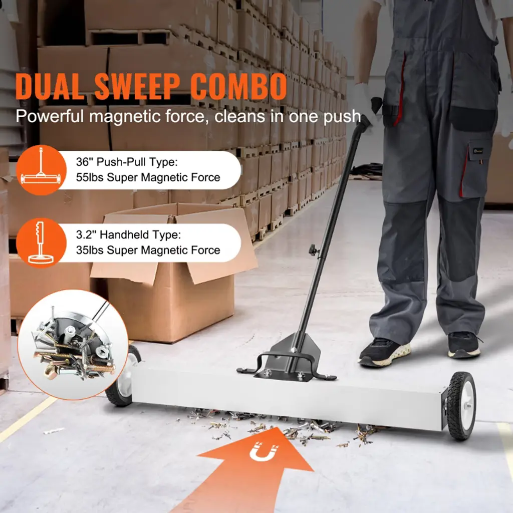 Feature: Superior Magnetic Power: The VEVOR magnetic sweeper with wheels includes a 36'' magnetic sweeper with wheels and a 3.2'' telescoping magnetic pickup tool, capable of holding up to 55 lbs (36'') and 35 lbs (3.2'') respectively. It effortlessly collects nails, screws, and black metal debris, protecting you from shards and sharp metals. Adjustable Heights: The telescoping handle allows for adjustable heights. The 36'' rolling magnetic sweeper adjusts from 30.3 to 44.5 inches (769.62 - 1130.3 mm), while the 3.2'' telescoping magnetic pickup tool adjusts from 9.06 to 33.46 inches (230-850 mm). Say goodbye to bending fatigue with convenient storage and easy portability. Ease of Use: After attracting magnetic objects, simply lift and release the handle for quick debris disposal. All collected metal particles will immediately drop, allowing for swift cleanup. The 6.89-inch rubber wheels are height-adjustable from 0.9'' to 2'' (22.86 - 50.8 mm), making the magnet sweeper easy to maneuver over gravel and grass surfaces. It includes a brush and gloves for added convenience. Durable Construction: Crafted from high-quality materials including aluminum, plastic, magnets, and iron, the nail magnet sweeper withstands rigorous work environments. Featuring an aluminum alloy shell + A3 steel bottom, it's corrosion-resistant and includes an ergonomic rubber handle for comfortable, prolonged use. The anti-disassembly screw design ensures stability, while the Ø6.89-inch (175 mm) PP + rubber wheels provide durability and traction. Versatile Application: With a wide cleaning range, our magnetic nail sweeper efficiently covers large surfaces to swiftly clear entire areas. Ideal for picking up damaged nails, screws, and black metal waste, especially useful in shops, roofing projects, or post-automotive or mechanical repairs. Pro tip: After projects, clean floors, lawns, garages, and workshops to prevent injuries. Package Content 1 x Magnetic Sweeper 1 x Telescoping Magnetic Pickup Tool 1 x User Manual 1 x Brush 1 x Glove