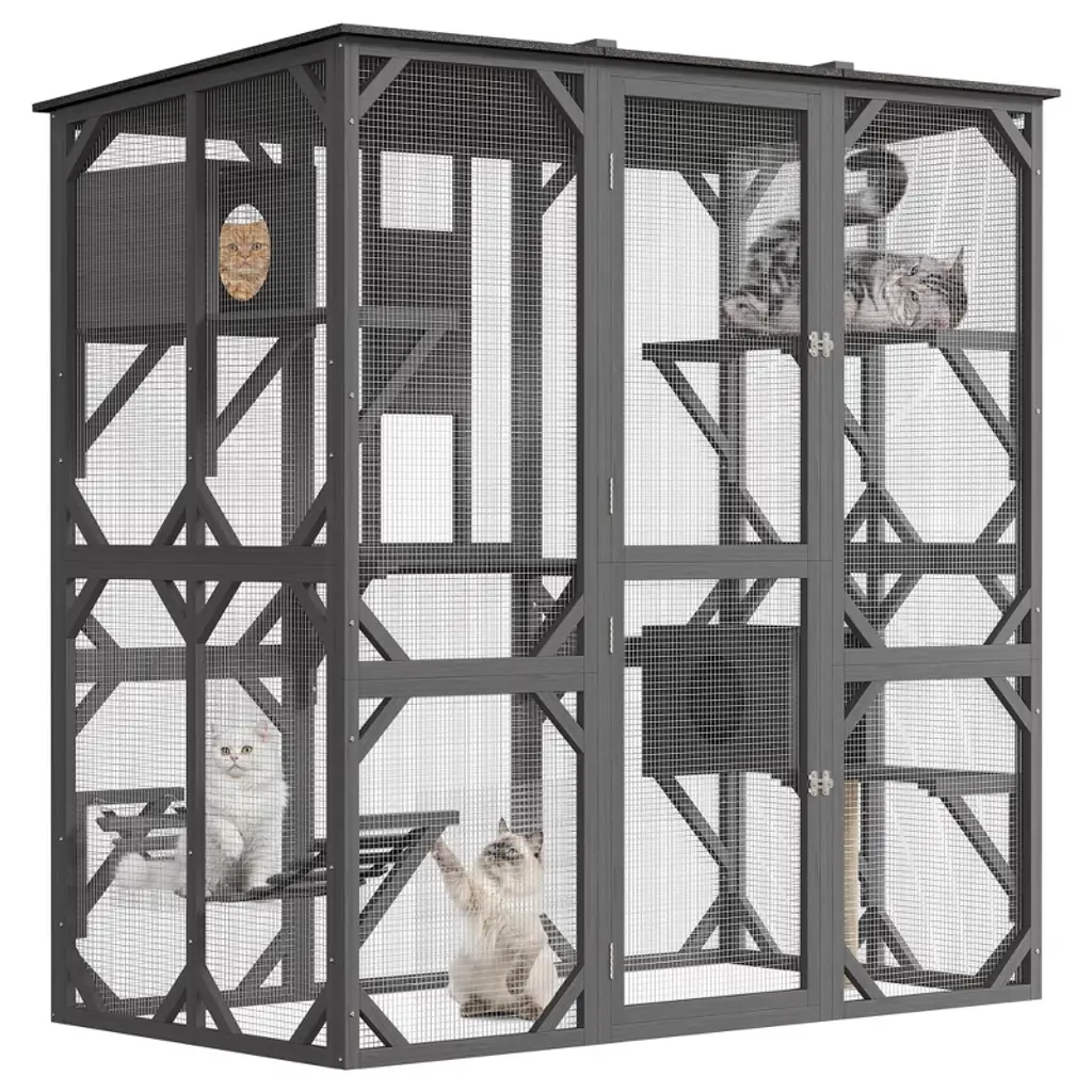 Spacious Space: VEVOR presents spacious cat houses available in 4-tier metal and 7-tier wooden models, accommodating 1-3 cats or other small animals such as birds, rabbits, or hamsters. The 4-tier model measures 35.4 x 23.6 x 51 inches, while the larger 7-tier model offers an expansive 71.2x34.6 x 66.5 inches, ensuring ample room for pets to play and move around. Sturdy, Elegant, and Durable: The 4-tier model is constructed from metal wire with a black rust-proof finish, boasting reliable strength and a capacity to withstand up to 30 lbs per tier, 120 lbs in total, with a net weight of 35.27 lbs/16 kg. The 7-tier model combines metal wire and fir wood for an elegant and durable structure, capable of supporting up to 30 lbs per tier, with a net weight of 44 lbs/20 kg. Quick Installation: Both catios come with installation tools and a detailed instruction manual, ensuring a hassle-free assembly experience. Practical Accessories: The 4-tier catio includes 4 platforms, 1 hammock, and 3 ladders, with 4 lockable casters for easy mobility. The 7-tier model features a waterproof roof cover, protecting pets from the elements, and 2 cat resting boxes for a comfortable sleeping environment. Easy to Clean: Each model offers convenience in maintenance, featuring doors for easy access and removable trays or components designed for daily cleaning. Package Content: 4-Tier Metal Catio: 1 x Cat House 4 x Lockable Casters 3 x Partitions 3 x Ladders 1 x Hammock 1 x Tray 1 x Wrench 25 x Zip Ties 7-Tier Wooden Catio: 1 x Cat House 1 x Waterproof Cover 2 x Gloves