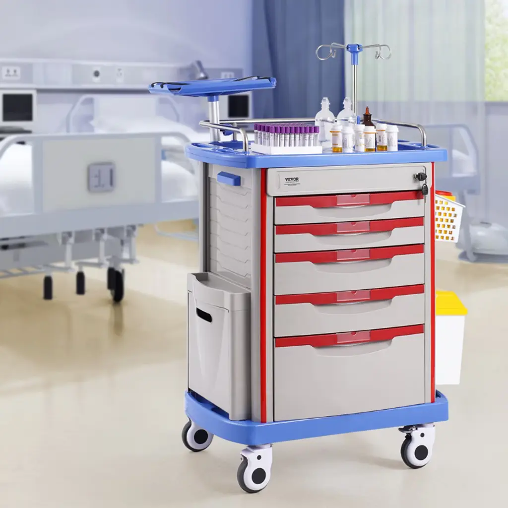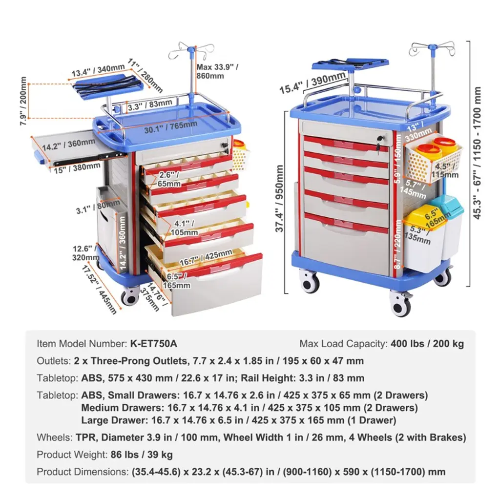 Feature: Stable Load Bearing: The lab cart is designed to securely hold medical equipment and supports up to 400 lbs. It features a widened top tray and anti-slip edges to safely place portable ultrasound scanners and other medical devices. Efficient Storage: Our lab utility cart includes a top tray and a large drawer for the efficient organization of various medical and laboratory supplies. The unique drawer design incorporates hidden, noise-reducing rails, ensuring privacy and easy access. Durable Construction: Constructed from high-density PP material and reinforced steel panels, the lab utility cart offers excellent resistance to impact and chemical corrosion. This ensures long-term durability and reduces maintenance costs. Comfortable Maneuvering: Ergonomic handles and four silent, wear-resistant casters with locking rubber wheels provide smooth and stable movement. The cart maneuvers easily whether traveling in straight lines or making agile turns. Versatile Adaptation: The rolling utility lab cart is equipped with accessories such as five smooth-sliding drawers, 30 adjustable partitions, a defibrillator bracket, a slide-out tray, a large storage box, a height-adjustable IV pole, a trash bin, a covered medical waste bin, a CPR board, a power board with three sockets, and an oxygen tank holder. It is ideal for busy hospitals, professional laboratories, and home care environments, offering adaptable storage Package Content: 1 x Lab Cart