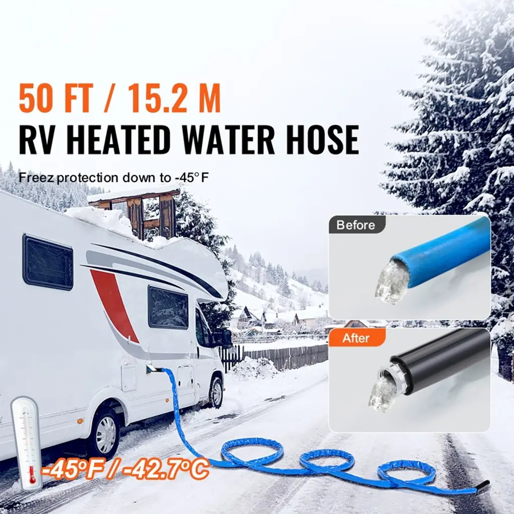 Feature: Stay Flowing in Low Temps: Even when winter nights drop to -45°F/-42.7℃, our heated RV water hose ensures steady water flow, preventing freezing and providing reliable water access. Available in 15, 25, 30, 50, and 100 ft lengths, it's perfect for RVs, trailers, boats, garden hoses, plant watering, and car washing in winter. Even Heating & Low Energy Consumption: The indicator light turns on when heating is in progress. The built-in heating element inside the water hose is 0.6" / 14 mm wide, wrapped in a textured outer layer that expands the heating surface for more even heat distribution. As the hose warms up, power consumption gradually decreases. Healthy Drinking Water: Besides preventing freezing, safety in water usage is essential. The inner RV winter water hose is made from drinking water-safe materials, free of lead and BPA, ensuring safe for washing fruits and vegetables and bathing. Leak-Proof Hose Connectors: Equipped with a 3/4" (1.9 cm) GHT aluminum connector, compatible with most US water sources. Fits garden and outdoor hoses, making it a versatile accessory. Includes waterproof rubber rings and thread seal tape for enhanced sealing. Smooth Water Flow: Designed with a kink-free structure to prevent slow or blocked water flow. The 5/8" I.D. supports high water flow. Suitable for water pressure below 4 MPa/600 PSI, with a durable corrugated PVC outer layer that resists road gravel and ice. Package Content 1 x Heated Water Hose 1 x 3/4" Male Connector 2 x Waterproof Rubber Rings 1 x Thread Seal Tape 1 x User Manual