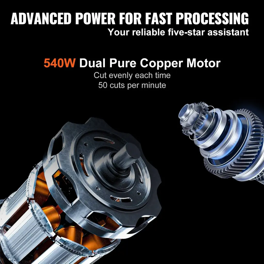 Precise Adjustable Thickness: Our meat slicer is equipped with a thickness-adjustable knob, making it effortless for you to easily adjust the slice thickness from 0mm to 15mm (0-0.6 inch) precisely. It is suitable for frozen meat, deli, cheese, roast beef, bread, vegetables, fruits, etc. According to your needs, cut ingredients of different thicknesses. Let's cut together! Sharp and Durable Blade: VEVOR's automatic meat cutter is equipped with a 10 inch alloy steel 75Cr1 blade, which is corrosion resistant, heat-resistant and keeps a sharp blade. Slicers can cut iron like mud, cutting cooked food and raw food healthier! 540W Dual Motor: The latest full automatic electric food slicer is driven by 540W fast and high-yield slicing power. The two pure copper motors have sufficient power and fast speed, which cuts up to 300 kg of meat per hour. It can cut almost anything and quickly prepare food for you. Built-in Sharpener: In order to facilitate knife grinding, the slice machine is equipped with a built-in grinding stone knife grinder. Grinding is easy and can be completed in less than a minute, which is more convenient to keep sharp edges on the blade and safer to use. Security-ensuring Designs: This electric food slicer has a blade guard for security, which avoids unintentional contact with the blade. Emergency stop switch provides added security and avoids accidental startup. The rubber bottom feet are nonslip, ensuring the stability. The oil injection port is convenient for oil injection once a month. Package Content 1 x Meat Slicer 1 x Oil Jug 1 x Belt 1 x Blade Sharpener 1 x Manual
