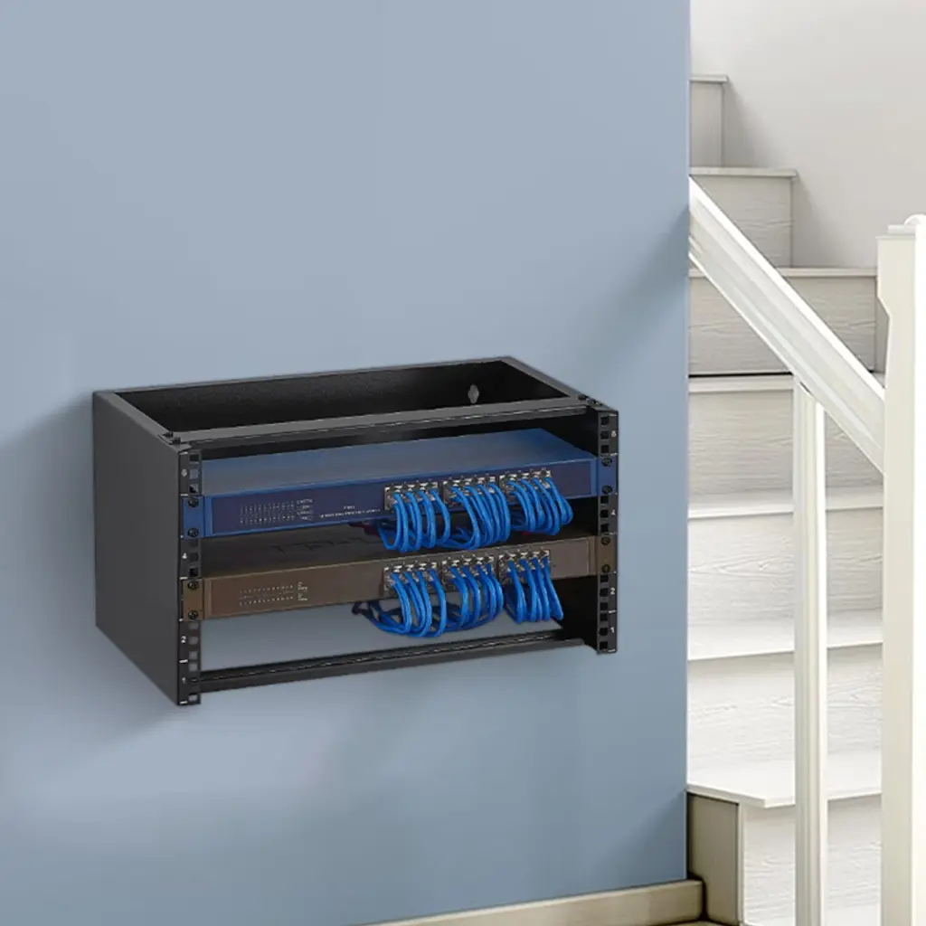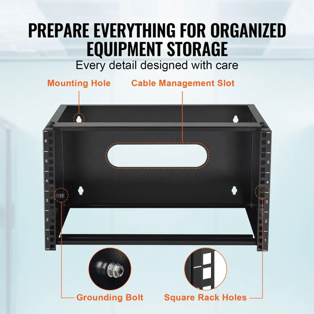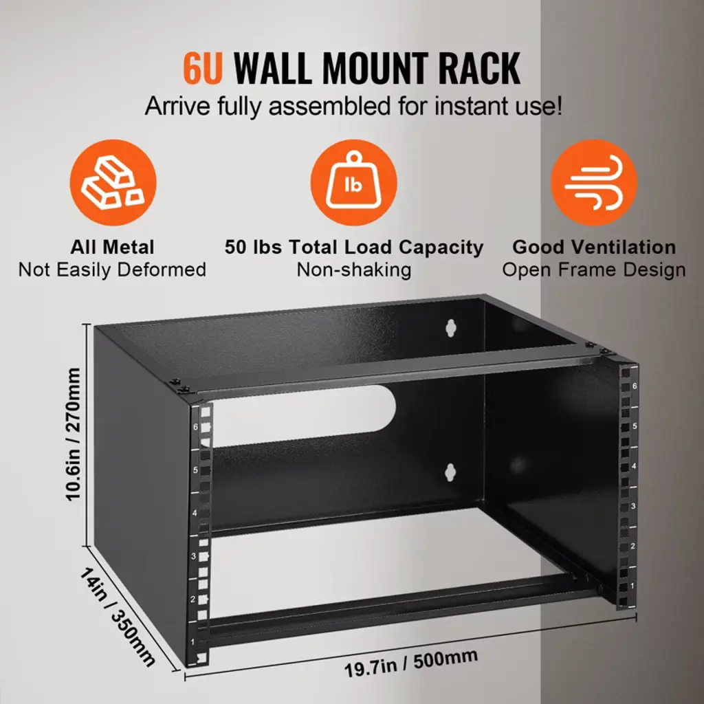 Feature: Double the Stability: With stabilizer posts at both the top and bottom, our wall mount network rack offers superior stability and pressure resistance compared to single-post network racks. Ensure your network equipment stays secure and operates smoothly, with added peace of mind. Heavy-Duty, Built to Last: Crafted from premium Q235 carbon steel with a sturdy 0.06" (1.5 mm) thickness, this wall mount network rack supports up to 50 lbs (22.68 kg), ensuring your equipment remains stable and secure, even under heavy loads. Say goodbye to wobbling and tilting! Pre-Assembled Convenience: Our wall-mount rack comes fully assembled before shipping, including M6 screws and cage nuts for easy mounting of switches, firewalls, and other equipment directly onto the steel frame. Experience long-lasting performance even with extended use! 6U Wall-Mount Rack: Featuring an open-frame design and a 2-post setup, this network rack supports a maximum installation depth of 14 inches. Comes with pre-installed grounding bolts, cable management slots, and mounting holes, making installation and wiring a breeze. Flexible Partition with Ease: Pair this wall mount network rack with our 1U server shelf (sold separately) to maximize your rack space and streamline your setup. Create a neatly organized space, reduce clutter, and avoid device collisions and interference. Enjoy a more efficient and tidy workspace with ease! Package Content 1 x 6U Wall Mount Network Rack