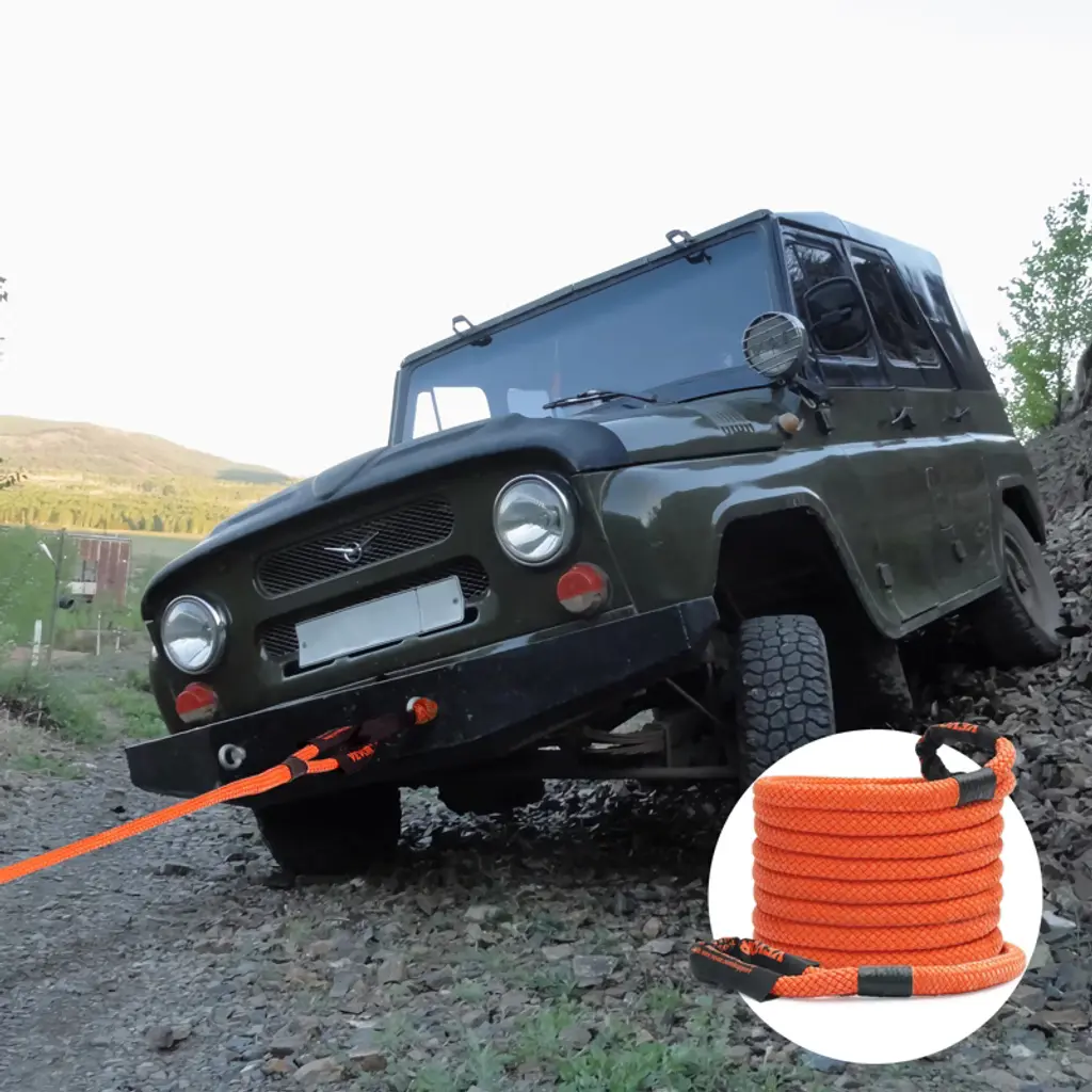 Feature: Heavy-Duty Vehicle Tow Strap: With an impressive 30,580 lbs breaking strength, our tow strap is perfect for towing trucks, off-road vehicles, and heavy equipment. At 30 feet long and 7/8 inches wide, it's your go-to for tackling any rugged terrain or emergency situation. Precision Weaving: Our tow rope is made from high-quality nylon and woven with precision using 32-core technology. It's not just strong and stable but also provides extra security during use. Plus, with special coating and PU treatment, it's waterproof and moisture-resistant, ensuring performance even in rainy or snowy conditions and lasting durability. Soft Shackle: Our recovery strap's soft shackle is crafted from tough synthetic fibers, boasting a hefty breaking strength of up to 41,750 lbs. Unlike traditional D-ring shackles, this soft shackle provides exceptional strength and flexibility. No worries about rust weakening its grip or overheating and slipping during towing due to friction. It's all about protecting your tow rope from wear and tear. Convenient Storage Design: Designed for easy storage and portability, our kinetic recovery rope is an ideal choice for both adventurous outings and everyday emergencies. It's compact and portable, fitting perfectly in your car, backpack, or closet without taking up extra space. Always be prepared without the clutter! Adventure-Ready Versatility: From deep mud, slippery snow, and desert exploration to mountain rescue, our recovery rope is up for any challenge. Specially designed for various complex environments and multiple vehicle types, it's compatible with SUVs, pickups, light and heavy trucks, and more. Package Content 1 x Tow Strap 1 x Waterproof Storage Bag 2 x Soft Shackles 1 x Velcro Tape