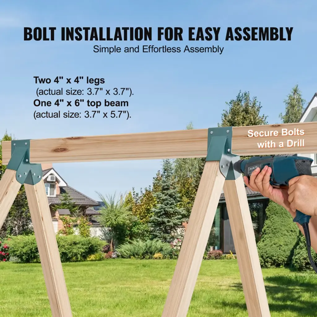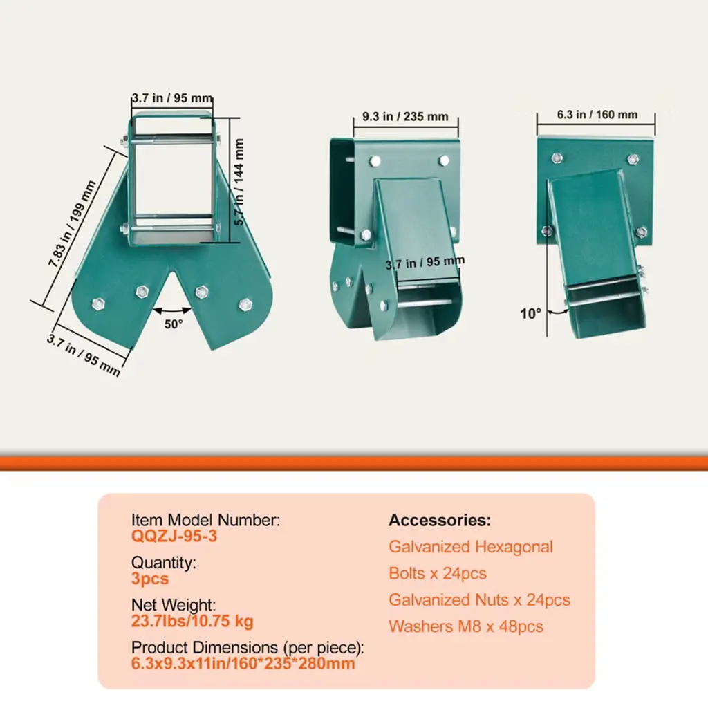Feature: Secure Support: The triangular A-frame structure of the swing frame provides stable and wobble-free support, ensuring the safety of children during play. It is recommended to use two 4" x 4" x 96'' legs (actual size 3.7" x 3.7") and one 4" x 6" x 114'' top beam (actual size 3.7" x 5.7"). Sturdy and Durable: The swing frame is constructed from carbon steel, making it robust and deformation-resistant. The surface is coated with a spray paint process, providing corrosion resistance and rust prevention, ensuring a long lifespan. Easy Installation: You can quickly install it following the user manual. The product comes with screw holes, making it convenient to secure in place with bolts, saving time and effort. Abundant Accessories: Our kit includes a wide range of accessories, including M8*110 galvanized hex bolts (24pcs), galvanized M8 nuts (24pcs), and M8 washers (48pcs), making installation easy and providing stable support. Versatile Use: It can be widely used for installing and securing swing frames in various settings, such as indoor and outdoor playgrounds, jungle gyms, and yards. Package Content Swing Bracket x 3 Galvanized Hexagonal Bolts x 24 Galvanized Nuts x 24 Washers M8 x 48