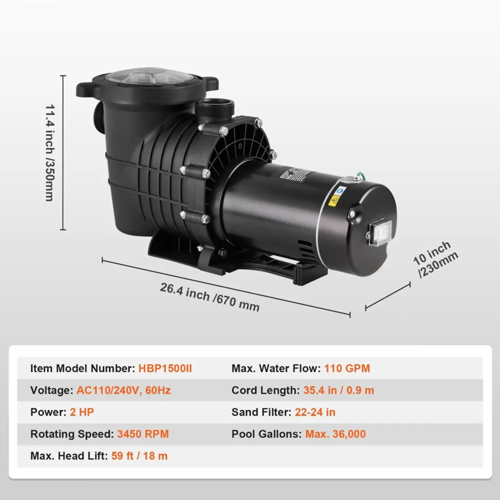 Above Ground Pool Pump, 2 HP, 110 GPM Max Flow Single Speed Swimming Pool Pump, 110V/240V 3450 RPM 59 ft Max Head Pool Pump with Filter Basket, for Above Ground Pools Hot Tubs Spas About the item: 2 HP Premium Copper Motor: With the ability to easily switch between 110 and 240V, it offers unmatched versatility. Paired with an aluminum motor casing, our pure copper motor ensures efficient and stable operation while incorporating built-in thermal protection. Our above ground pool pump is the perfect choice for circulating water filtration. Say goodbye to cloudy pool water and hello to sparkling clarity with our pool pump! Corrosion-Resistant Thickened Shell: Unlike other pumps, our pool pump features a PP shell that withstands harmful substances. With its integrated structure, it boasts leak-free, wear-resistant properties, ensuring durability even when handling water treated with disinfectants. Dive into worry-free pool maintenance with our pump! Efficient Water Circulation System: With an 110 GPM Max. Water Flow and 59 ft / 18 m Max. Head lift, our pool pump ensures rapid water circulation. Its detachable filter basket, compatible with a sand filter (not included), facilitates physical purification and keeps your pool water crystal clear. The PVC cover allows you to monitor accurately when the basket needs cleaning. Enjoy consistently pristine pool bottoms every time! Security & Quality is Our Priority: Our single-speed pool pump can ensuring you can enjoy your pool with peace of mind. We've also incorporated grounding terminals to connect to ground lines for added security assurance. Pump out the heat and enjoy our premium pump all summer long, knowing it's built to the highest security standards. Experience Unparalleled Versatility: The swimming pool pump is ideal for above-ground pools, hot tubs, spas, wellness centers, and irrigation systems. However, it should not be used with storage tanks. Elevate your summer experience with crystal-clear water, ensuring every moment spent in your pool is pure bliss. Say hello to endless enjoyment and goodbye to worries about water quality! Package Content: 1 x Pool Pump 2 x Internal Thread Connectors 2 x Sliding Joint Connectors 1 x PTFE Tape 1 x User Manual