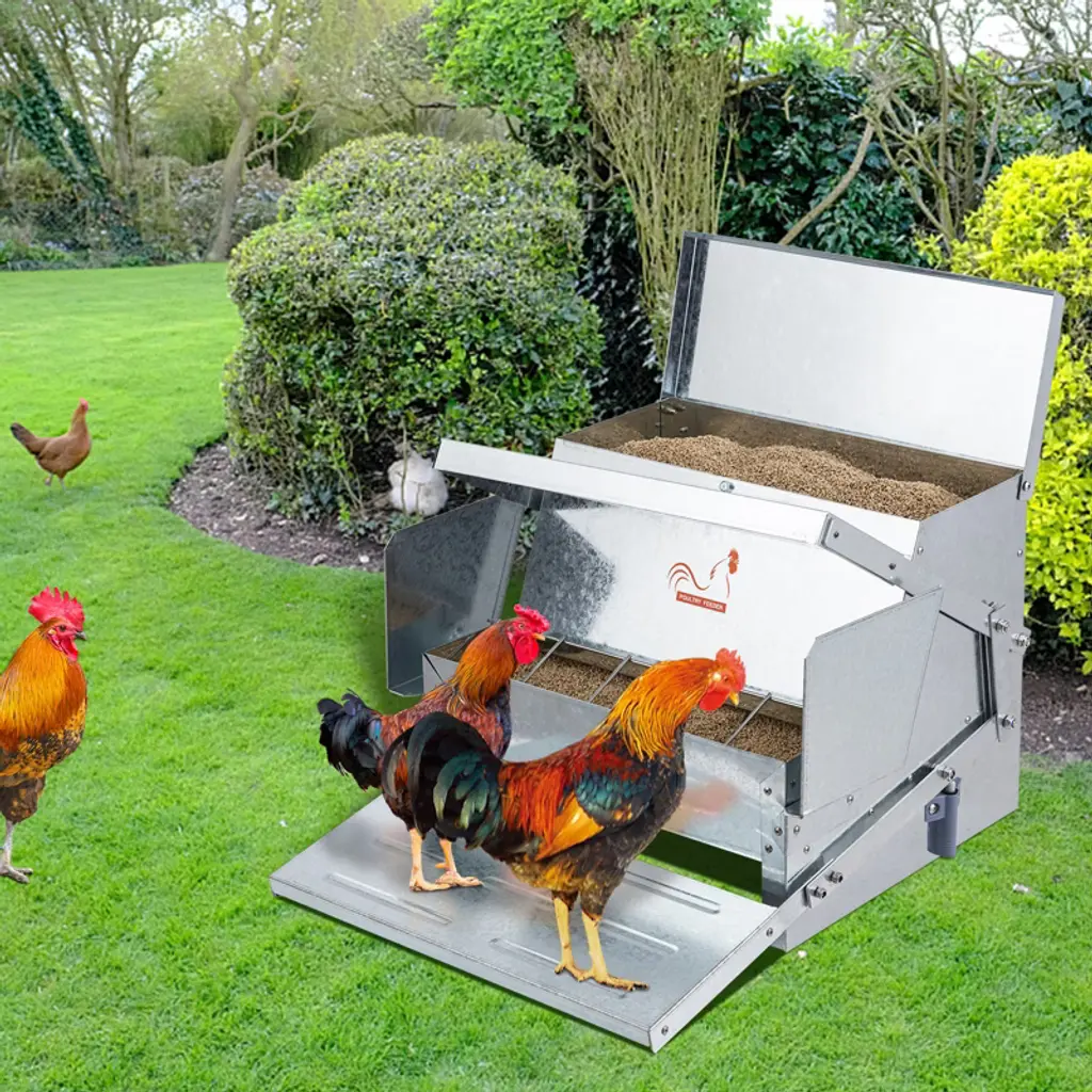 Feature: 25 lbs Large Capacity: Our self-service automatic chicken feeder offers a spacious storage space, holding up to 25 lbs/11 kg of feed. It can feed 10 chickens for about 11 days, allowing them to eat freely without the need for constant supervision or intervention. Save time on daily feeding routines! Feed Protection: Designed with a magnetic lock, our treadle chicken feeder prevents wild birds from opening it and stealing the feed. This not only saves on feed costs but also eliminates wastage. Slip-proof Pedal: The poultry feeder with a non-slip pedal, ensures that your poultry can eat without slipping and maintaining a stable stance. This promotes proper feeding habits and helps them adapt to the feeder more quickly. Premium Material: Our chicken feeder is constructed with high-quality galvanized steel, built to withstand extreme outdoor conditions. It is durable, resistant to rain, and offers excellent rust protection, keeping the feed clean and fresh. Easy Adaptation: With three adjustable angles, our feeder for chickens allows poultry to gradually adapt to it. The side protection plates guide them to the correct feeding position, preventing them from eating on both sides and reducing training costs. Package Content 1 x Automatic Chicken Feeder 1 x Hex Wrench 2 x Nuts 2 x Screws 4 x Locknuts