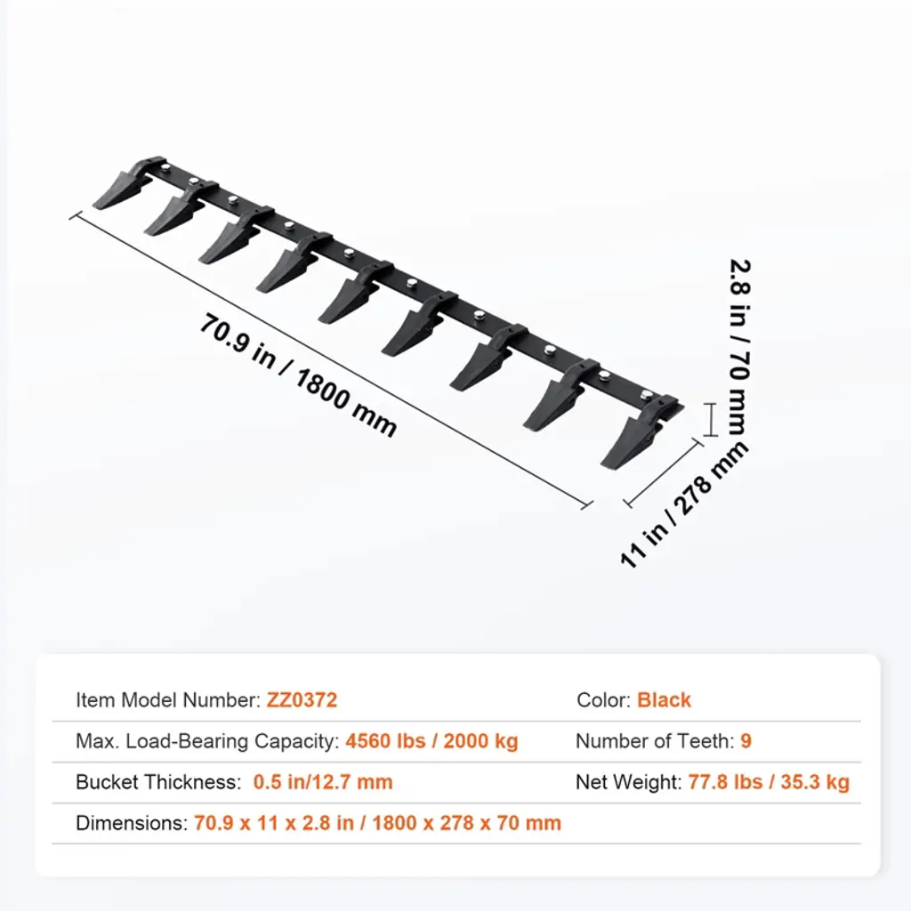 Feature: Heavy-Duty 230 Curved Shank: Compared with most flat digging teeth, our curved shank is designed to fit the digging bucket for superior efficiency and minimal effort. With a staggering 4560 lbs capacity to breeze through the toughest digging and transporting jobs. Transform your work with our ultimate bucket tooth bar in digging innovation. Installation Is A Breeze: Our bucket tooth bar is designed for effortless setup through rivet fastening and is further reinforced with bolts. It is compatible with most loader types, and the innovative bolt-clamping design ensures a secure, shake-free connection with your bucket. Experience ease and reliability in every job. Fully Automated Welding Technology: Unlike the traditional manual welding that risks weld fractures, our fully automated welding technology ensures every joint on the bucket tooth bar is seamlessly connected, guaranteeing stability and resistance against breakage, even through extended, high-intensity use. Trust in unparalleled strength and reliability for your toughest tasks. Built Tough to Last: Experience unmatched durability with our loader bucket tooth bar, crafted from Q345 alloy steel for superior toughness over traditional carbon steel materials. Enhanced with an anti-rust coating, we avoid metal-air interactions, safeguarding against rust and corrosion and extending the tractor tooth bar's lifespan. Versatility at Its Best: Unlock versatility with our 72'' tooth bar for tractor buckets, your multi-purpose tool designed for a wide array of projects. Perfect for excavating loose soil, sand, sod, and gravel, this tooth bar for loader bucket adapts to your needs, making it essential for urban construction, mining, railway lines, roads, and hydraulic projects. Package Content 9 x Pins 9 x Hex Flat End Bolts 10 x Screws 10 x Nuts