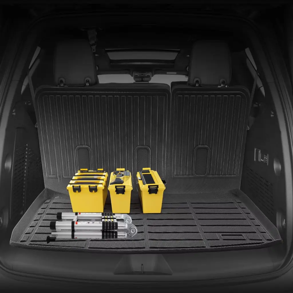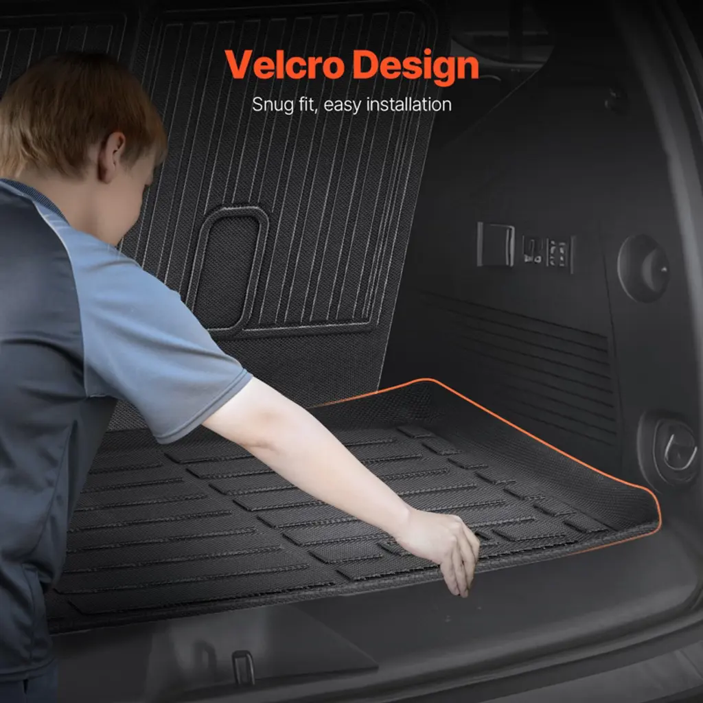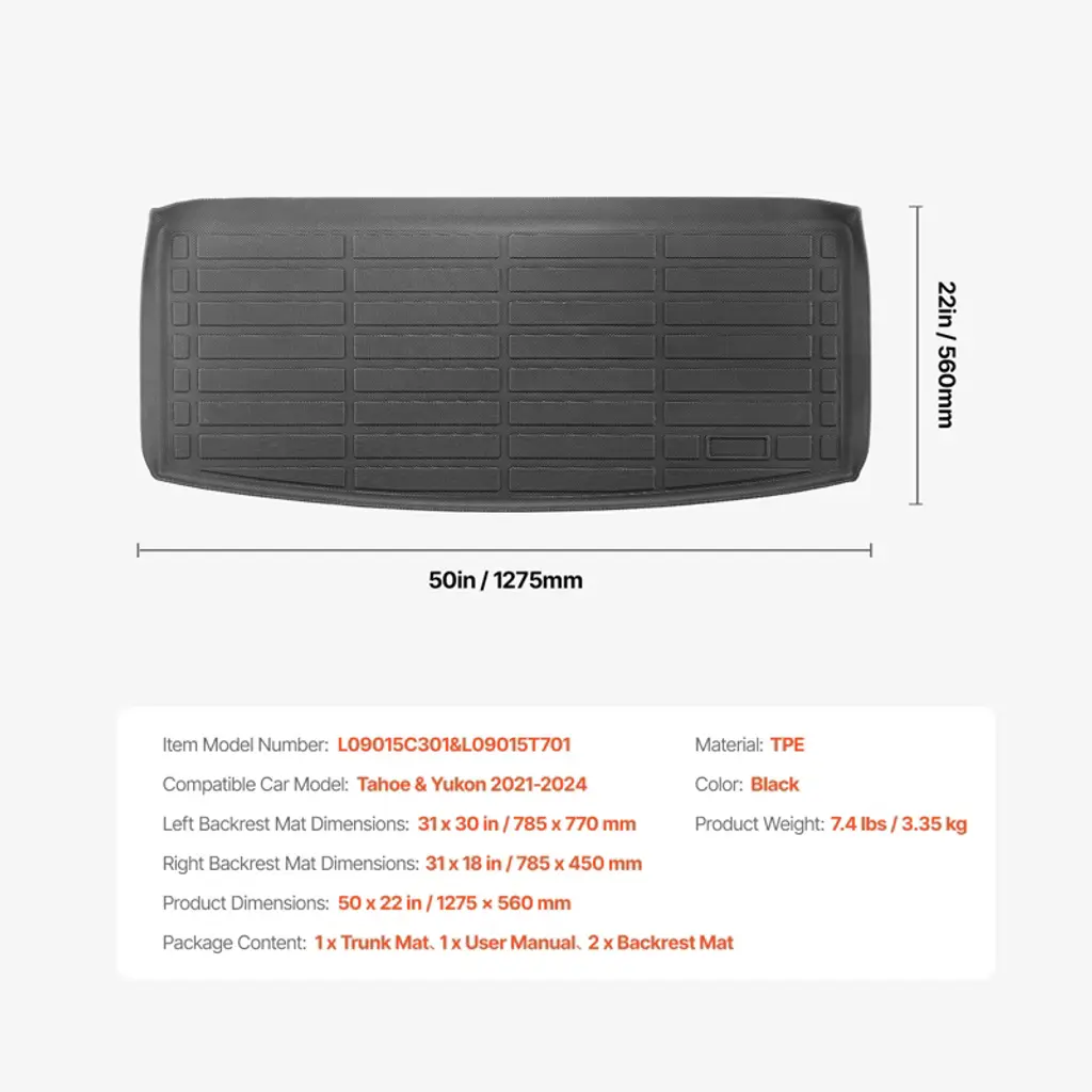 Feature: Custom Fit: Compatible with 2021-2024 Chevy Tahoe & GMC Yukon models, this cargo mat and backrest mat set uses advanced 3D technology to precisely capture the vehicle’s data, ensuring a flawless fit. Not only does the cargo liner add a little touch of style to your car, but elevates its overall interior appeal. Snug & Secure: The backrest mat features Velcro on the back for easy installation, and the cargo mat can be placed and adjusted effortlessly without any tools, offering the perfect blend of convenience and functionality. It provides exceptional stability, staying securely in place to meet all your practical needs. Waterproof & Durable: Crafted from all-weather TPE material, this trunk cargo mat is built to last. Our custom fit car mats are wear-resistant, waterproof, and easy to clean, offering reliable protection against spills and wear while maintaining its shape over time. Raised Edge Design: The uniquely raised edge on the truck liner mat effectively prevent liquid spills, keeping stains at bay and ensuring your car stays clean and fresh. Anti-Slip Surface: The innovative 3D grooves significantly increase friction, help your cargo stay secured from sliding during transport and giving you the confidence that your items are safe throughout the journey. Package Content: 1 x Cargo Mat 2 x Backrest Mat 1 x User Manual