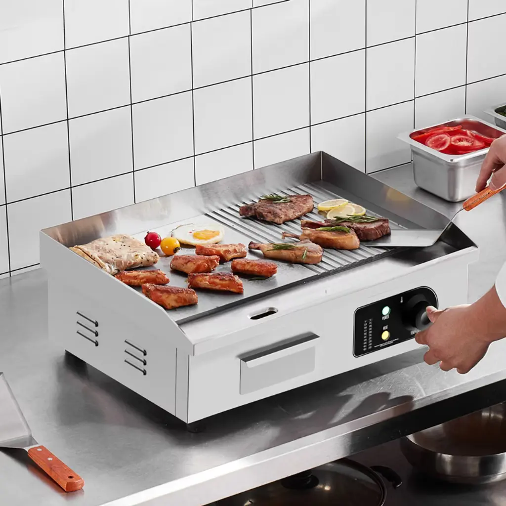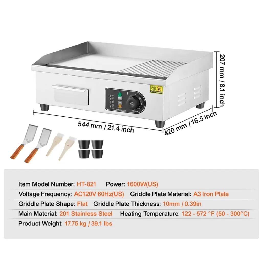 Feature: Even Heating: The commercial electric griddle features an upgraded thickened 10mm / 0.39in iron cooking plate. The U-shaped dense heating tubes are evenly distributed, ensuring uniform temperature across the entire grill. The high-power setting allows for rapid heating of food. Spacious Cooking Area: Our commercial griddle boasts a high-quality A3 iron plate with a non-stick surface and cast iron cooking surface. The cooking surface measures 21.26 x 11.81 inches, providing ample cooking space at once. You can cook multiple dishes simultaneously on this griddle to meet your fast and high-volume demands. Precise Temperature Control: The electric commercial griddle's temperature range is 122 - 572 °F (50 - 300°C). Multiple temperature settings can meet various food cooking needs, allowing you to select the temperature according to your dish. More Details: The widened oil drain hole of the half-flat top electric griddle helps remove waste oil. The oil collection tray gathers waste oil and food, making it easy to dispose of. Rubber feet make the griddle more stable. The raised oil baffle prevents oil splashes. Wide Application: The electric commercial flat top grill is suitable for both home and commercial settings, such as restaurants, shops, roadside stands, and snack bars. It is perfect for preparing pancakes, crispy bacon, grilled cheese, hearty breakfasts, fried dishes, omelets, pizzas, steaks, and burgers. Package Content: 1 x Commercial Electric Griddle 2 x Spatulas 2 x Brushes 4 x Foot Pads