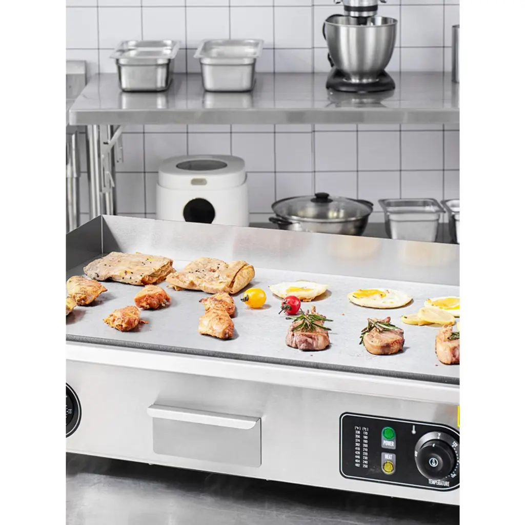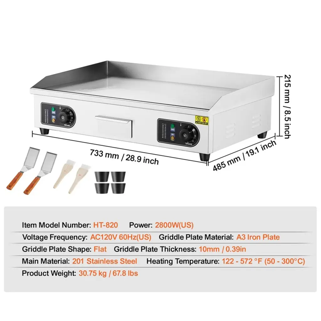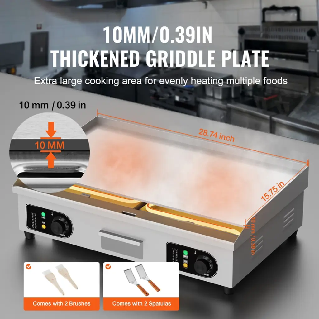 Feature: Even Heating: The commercial electric griddle features an upgraded thickened 10mm / 0.39in iron cooking plate. The U-shaped dense heating tubes are evenly distributed, ensuring uniform temperature across the entire grill. The high-power setting allows for rapid heating of food. NOTE: To prevent circuit breakage, this griddle is compatible with Single-Pole Circuit Breaker (>30Amp). Spacious Cooking Area: Our commercial griddle boasts a high-quality A3 iron plate with a non-stick surface and cast iron cooking surface. The cooking surface measures 28.74 x 15.75 inches, providing ample cooking space at once. You can cook multiple dishes simultaneously on this griddle to meet your fast and high-volume demands. Precise Temperature Control: The electric commercial griddle's temperature range is 122 - 572 °F (50 - 300°C). Multiple temperature settings can meet various food cooking needs, allowing you to select the temperature according to your dish. More Details: The widened oil drain hole of the flat top electric griddle helps remove waste oil. The oil collection tray gathers waste oil and food, making it easy to dispose of. Rubber feet make the griddle more stable. The raised oil baffle prevents oil splashes. Wide Application: The electric commercial flat top grill is suitable for both home and commercial settings, such as restaurants, shops, roadside stands, and snack bars. It is perfect for preparing pancakes, crispy bacon, grilled cheese, hearty breakfasts, fried dishes, omelets, pizzas, steaks, and burgers. Package Content: 1 x Commercial Electric Griddle 2 x Spatulas 2 x Brushes 4 x Foot Pads