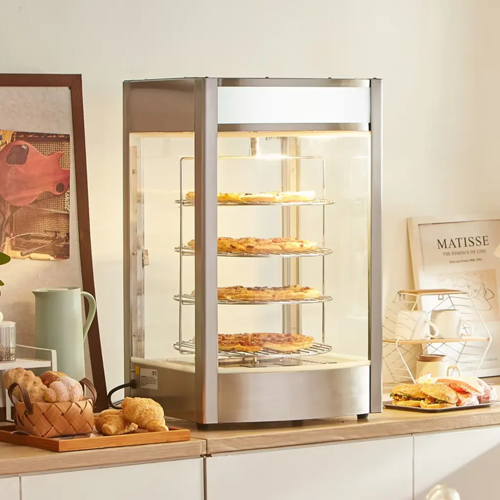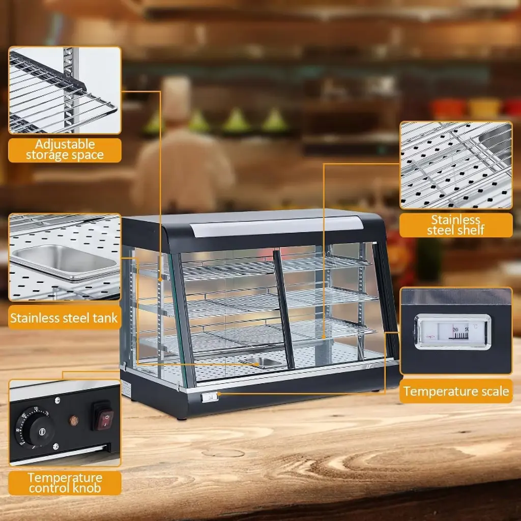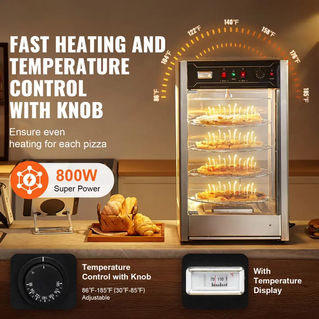 Feature: Temperature Control with Knob: Worried about your pizza getting cold? Our pizza warmer uses internal steam heating to ensure your pizza stays warm. With a wide temperature range of 86℉~185℉ (30-85 ℃), you can keep various foods at their optimal heating state at all times. It's easy to operate with a knob for temperature control, and the exterior of the warmer has a temperature display screen so that you can monitor the temperature in real time for more accurate heating. 4-Tier Large Space: Dimensions: 18.3 x 18.1 x 30.7 inch / 465 x 460 x 780 mm. Inside our display cabinet are 4 spacious food-grade shelves, capable of storing and displaying 4 14-inch pizzas, perfectly meeting your needs. Circulating Rotation: Unique circulating rotation design ensures even heating, delivering warm and crispy pizza with every bite. The 25W lighting lamp, combined with rotating display, provides a superior food presentation effect. Heat Preservation: Equipped with a 0.5L water tank, it keeps fresh for food through steam heat conduction, preventing excessive dryness caused by heating and rejecting shriveled, cold, and hard textures. Make Your Food Stand Out: Thickened tempered glass ensures food is clearly visible, while the sturdy stainless steel structure prevents rust and corrosion, designed for long-term use. The top LED advertising light decorates your storefront practically, and removable pizza trays make cleaning easier. It's the best choice for pizza shops, dessert shops, burger joints, restaurants, cafeterias, and hotels. Package Content: 1 x Pizza Warmer 1 x Instruction Manual