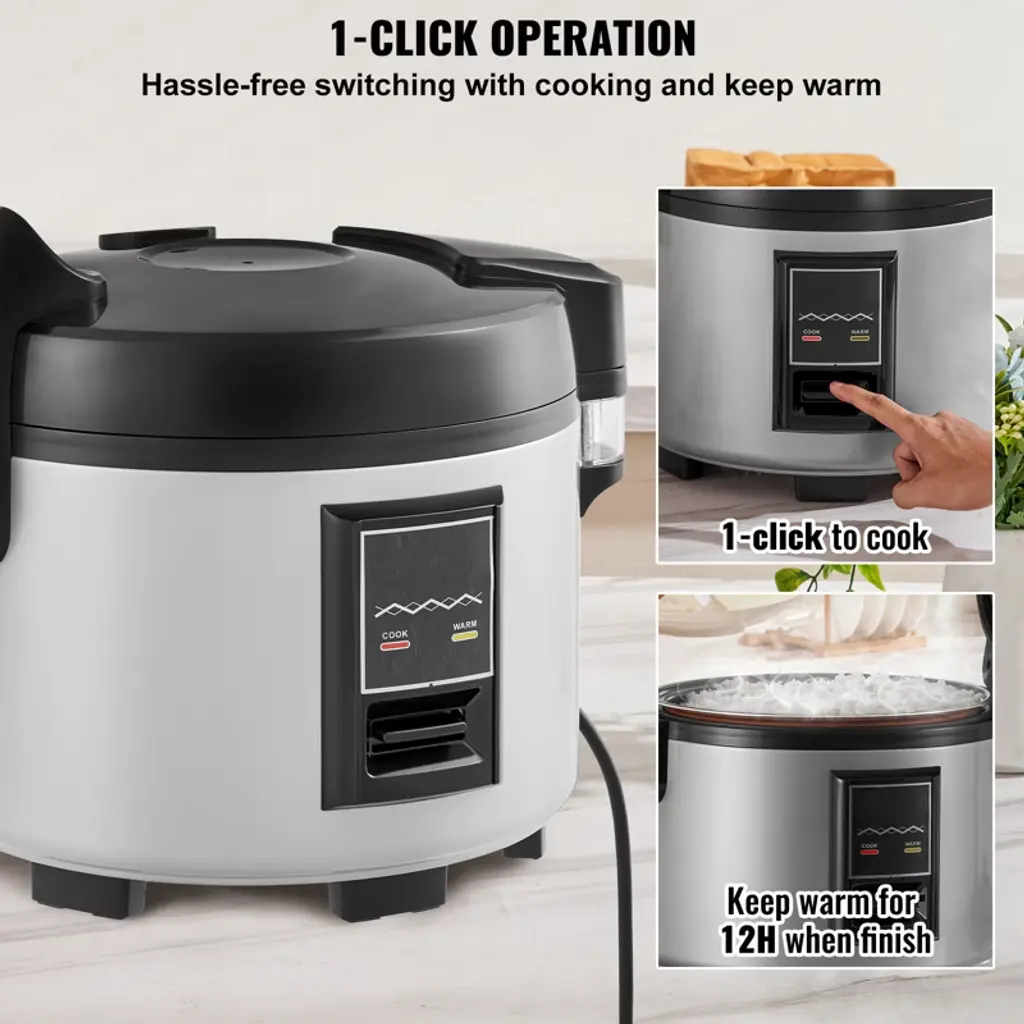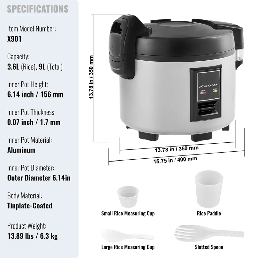 Feature: Durable Construction: The VEVOR commercial rice cooker is made entirely from high-quality materials, resistant to rust and corrosion, durable, and resistant to wear even with long-term use. It's easy to clean and maintain, extending its service life. Super Large Capacity: With a total capacity of 9 liters and the ability to cook 3.6 liters of rice at once (equivalent to 45 cups of rice), it's ideal for meeting the needs of 30-40 people. Whether for large family gatherings, parties, or commercial settings, this rice cooker can serve you well. 3D Efficient Heating: Utilizing 3D heating design, this rice cooker achieves efficient heat control, optimizing the heating curve. Coupled with improved structural design for better heat control, it ensures superior rice cooking results while minimizing the risk of bottom sticking. High-Quality Non-Stick Inner Pot: The non-stick inner pot and streamlined design make cleaning effortless. The non-stick surface prevents rice from sticking together, ensuring delicious and fluffy grains every time. One-Touch Control: This commercial rice cooker features one-touch operation; once the rice is cooked, it automatically switches to keep-warm mode, making it simple and straightforward. Just press a button to start the cooking process and easily switch to keep-warm mode. Package Content: 1 x Commercial Rice Cooker 1 x Small Rice Measuring Cup 1 x Large Rice Measuring Cup 1 x Rice Paddle 1 x Slotted Spoon