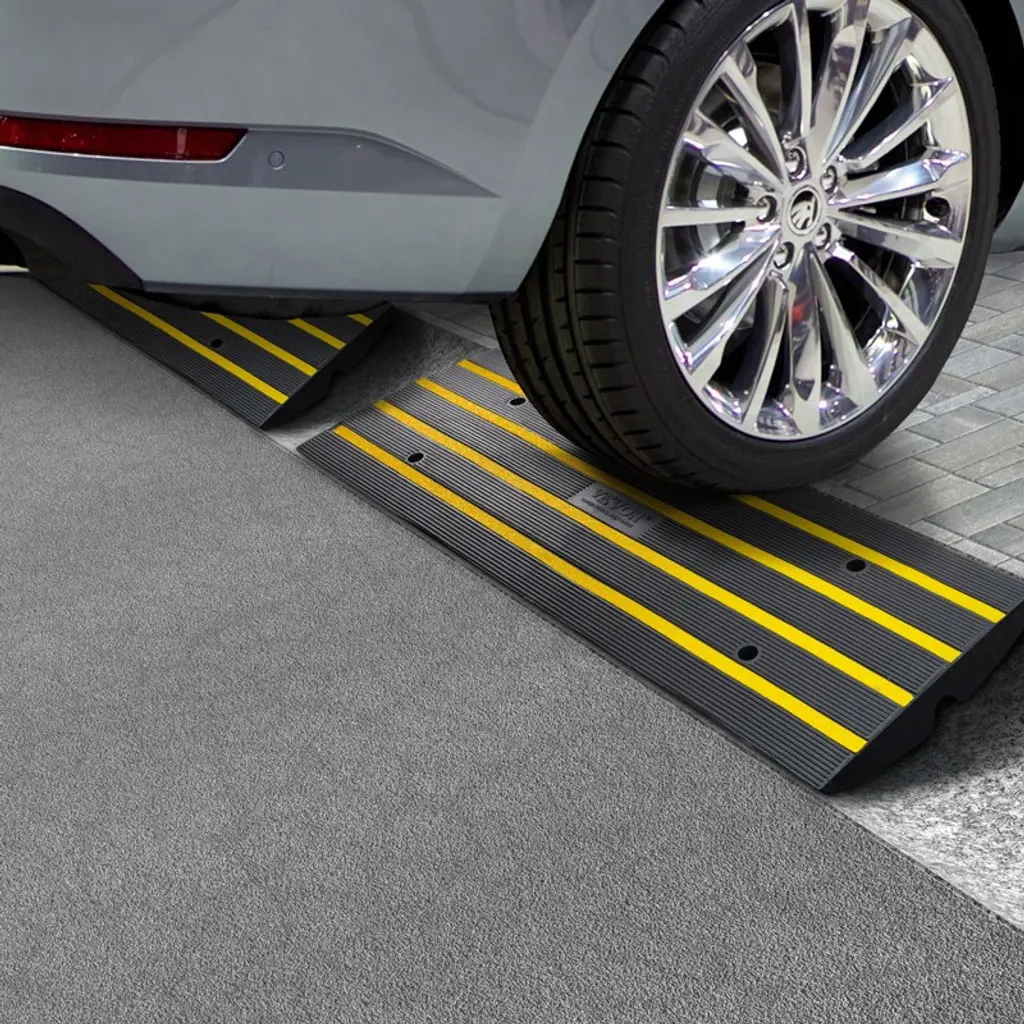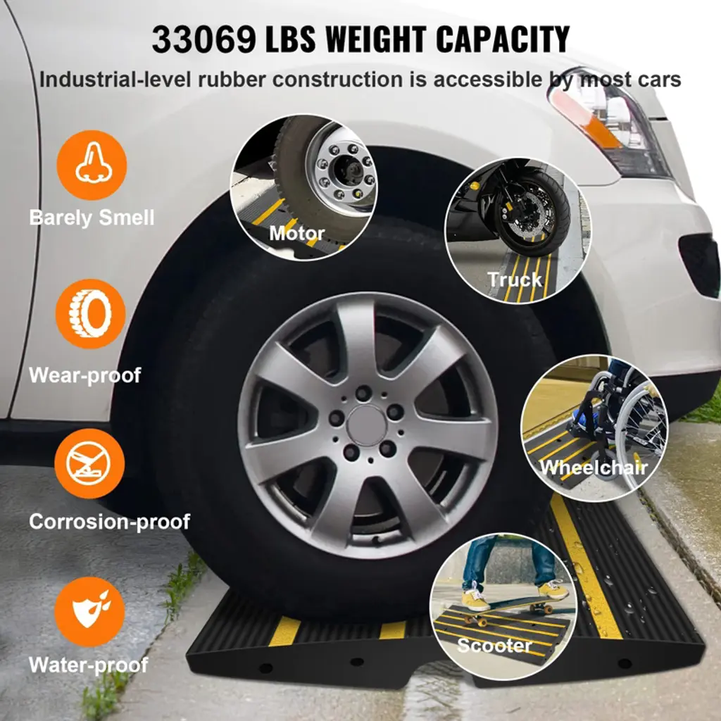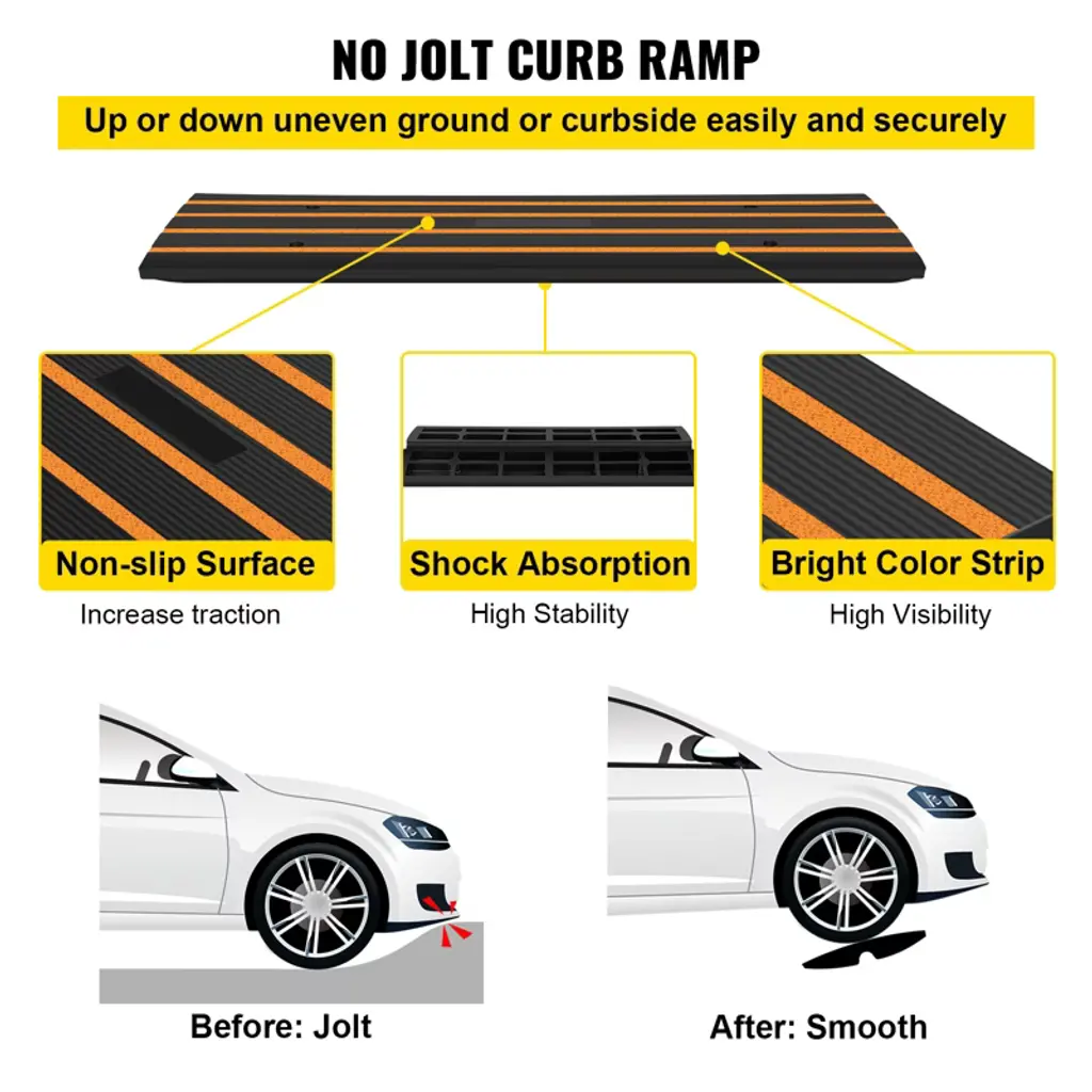 Feature: Rolled Curb Ramp with Channel: Size: 48.1" L x 16" W x 2.6" H/122 x 40.5 x 6.5 cm. Designed to help your motor vehicles get over curbs or elevated sidewalks easily and without damage. Besides, the curb bridge can be permanently installed in high-traffic areas to create a secure driving environment for driveways, parking lots, and more. Channel size: 2.2" W x 1.4" H/5.5 x 3.5 cm. A channel on the bottom features cable protection and water drainage. Fit the most common types of rolled curbs. Max. 33069 lbs Capacity Rubber: The driveway curb bridge is constructed with rubber, recycled, wear-proof, and weather-proof for long-lasting usage under various outdoor conditions. Such industrial-level rubber construction can support up to 33069 lbs of loading. Suitable for standard vehicles like SUVs, vans, mobile wheelchairs, motorcycles, bikes, scooters, and hand trucks to pass through securely up or down uneven ground or curbside. User-friendly Detail for Security: Non-slip texture strips on the surface for your car to pass smoothly and stably; Bottom shock absorption can control traffic speed while no damage to the car or road; Traditional black+yellow color with a reflective coating provides a high degree of visibility, notice drivers and passer-by slow off even at night and at low light environments. Full Accessory for Installation: Time-saving and cost-saving to assemble the curb ramp by yourself. Having all needed pre-drilled holes and mounting screws as a temporary device for children's play areas or permanently installed on gravel, asphalt, and concrete roads to keep away from being stolen or moving. Please measure your driveway curb ramp before you choose our driveway ramp. Indoor & Outdoor Scenario: The curbside bridge ramp is ideal for indoor and outdoor usage, Particularly suitable in public places like playgrounds, venues, sporting events, exhibition halls, homes, garages, driveways, loading docks, etc. Package Content 1 x Rubber Threshold Ramp 12 x M8*10 Expansion Screws