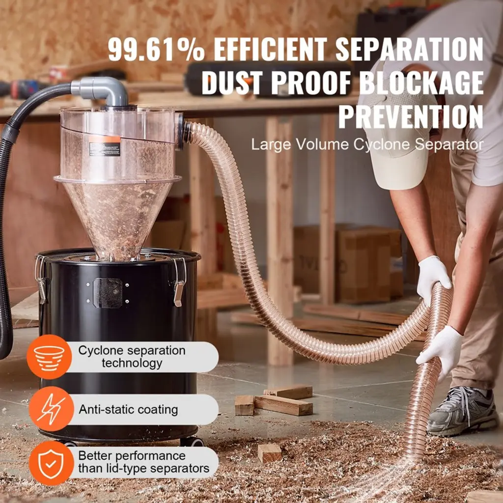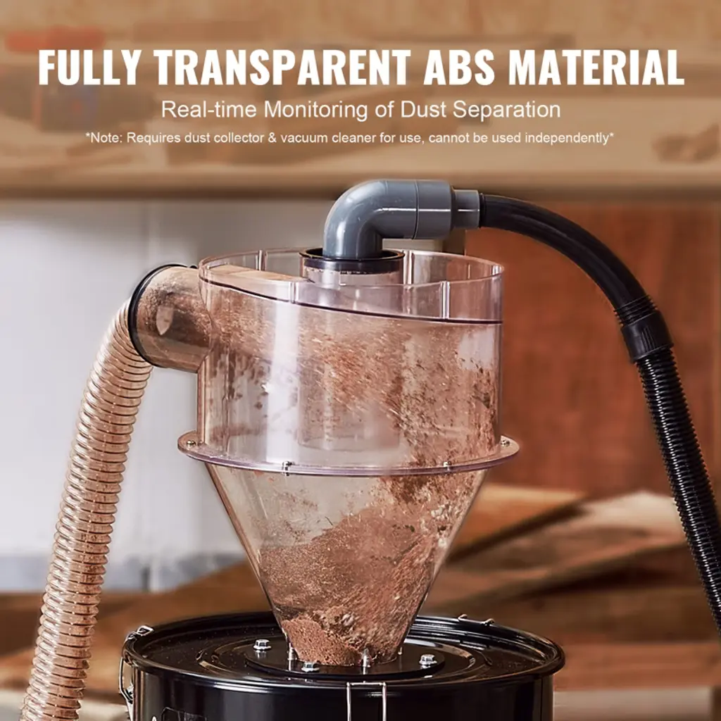 Feature: 99.61% High Separation Rate: Utilizing cyclone separation technology, it quickly captures and separates dust particles with a separation rate of up to 99.61%, reducing the frequency of vacuum filter replacements. Visual Design: The dust deputy features a fully transparent design, allowing you to monitor the separation process without opening the device. This clear view ensures you can see the dust collection in real-time, making maintenance more convenient and efficient. Compatible with 4.0-inch/101.6mm Hoses: The dust extractor's inlet and outlet are designed with a 3.81-inch/97mm diameter, suitable for commercial vacuum hoses of 4.0 inches. It also includes a 1.97-inch/50mm adapter, making it compatible with 2.0-inch household vacuum hoses. With a 13.21-Gallon/50L Collection Barrel: The large-capacity iron dust collection barrel is robust and durable. It features four casters for easy mobility. The complete accessory kit includes multiple attachments and a wrench, ensuring a hassle-free installation process. Ideal for Various Applications: Thanks to its high-efficiency separation, it easily handles cleaning tasks in workshops or woodworking studios. Whether you're dealing with fine sawdust or larger debris, this separator ensures your workspace remains clean. Package Content Cyclone Separator x 1 3.81-inch to 1.97-inch Conversion Adapter x 2 1 Meter Sealing Strip x 1 Sealing Washer x 1 2-inch PU Hose (2M) x 1 Instruction Manual x 1 2-inch Clamp x 2 4-inch Clamp x 2 50mm Inner Diameter Elbow x 1 50mm Outer Diameter Straight Pipe x 1 50mm to 32mm Inner Diameter Conversion Adapter x 1 50L Bucket (with Cover) x 1 Bucket Bottom Casters x 3 M8 * 12 Screws x 4 M8 Nuts x 4 Washers x 4 Wrench x 1