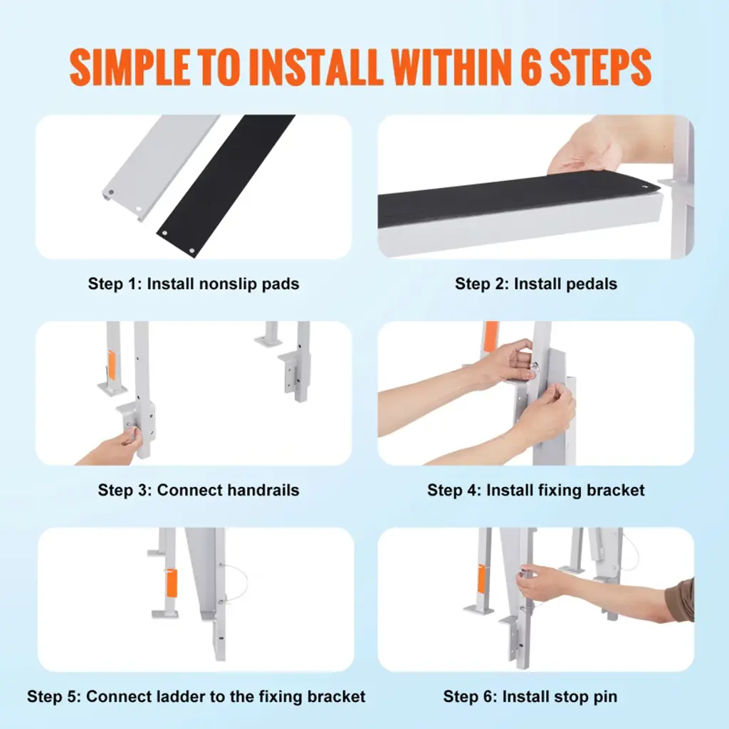 Feature: Flip-Up Design: Manually flip the ladder up and out of the water when not in use, avoiding seaweed twining and seawater corrosion. Quickly release or fix the ladder by pulling out or inserting the stop pin. Strong Weight Capacity: Our dock ladder is made of thickened 6063 aluminum alloy, and the surface adopts a special sandblasting process for great load-bearing, scratch resistance, and corrosion resistance. The load capacity can reach 350 lbs, stable and not deformed. Nonslip Pedals: This ladder contains 18x4 inches 4-step large pedals. The pedals allow you to get up and down the ladder comfortably and securely. Ergonomic Design: 12 in step distance better fits body usage habits, which is more comfortable and labor-saving for you to enter the water and go ashore. The thickened round handrails bring you comfortable holding with hands. Apply It Everywhere: The dock ladder is specially designed to complete most boarding tasks. It is widely used in docks, sea boarding, swimming pools, etc. Package Content 1 x Dock Ladder 1 x Stretch Cord 1 x Manual