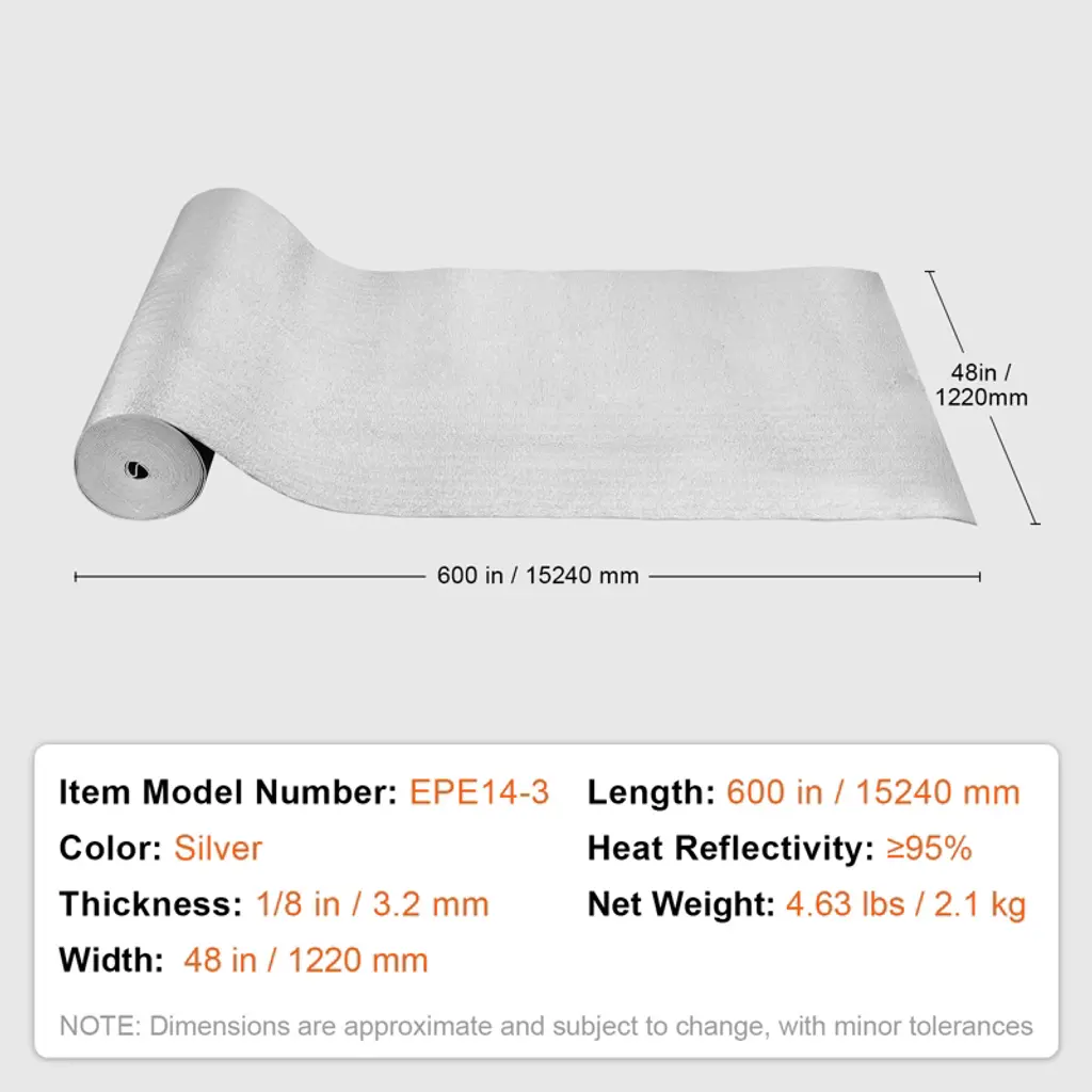 Feature: 3-in-1 Design: VEVOR 50 ft x 48 in double reflective insulation roll features a versatile 3-in-1 design: Radiant Barrier + Insulation + Vapour Control, ensuring exceptional thermal performance. Excellent radiant barrier keeps you cool in summer and warm in winter, maintaining a comfortable indoor temperature year-round. Premium Materials: Crafted from double reflective aluminum foil and high-density EPE foam core, our 3.2 mm thick heat reflective insulation roll efficiently reflects sunlight and blocks heat transfer in summer, while preventing indoor heating loss in winter. Stay cool in summer, keep warm in winter! Reflects Over 95% of Heat: Featuring high-density aluminum foil coating with outstanding heat reflectivity, this double reflective foam core radiant barrier efficiently reflects more than 95% of solar heat. Experience rapid heat dissipation, keeping your space cool and comfortable during hot days. Easy Installation: This double-sided aluminum foil insulation roll is easy to cut and install. It is convenient to DIY the roll size and shape to meet your different needs. When not in use, it can be easily folded up for space-saving and convenient carrying. Versatile Applications: Our thermal insulation heat shield is tear and puncture-resistant, scratch and wear-resistant, strong and lightweight. It's perfect for windows, garage doors, RVs, houses, roofs, etc, offering effective heat blocking and insulation wherever needed. Package Content: 1 x Double Reflective Insulation Roll