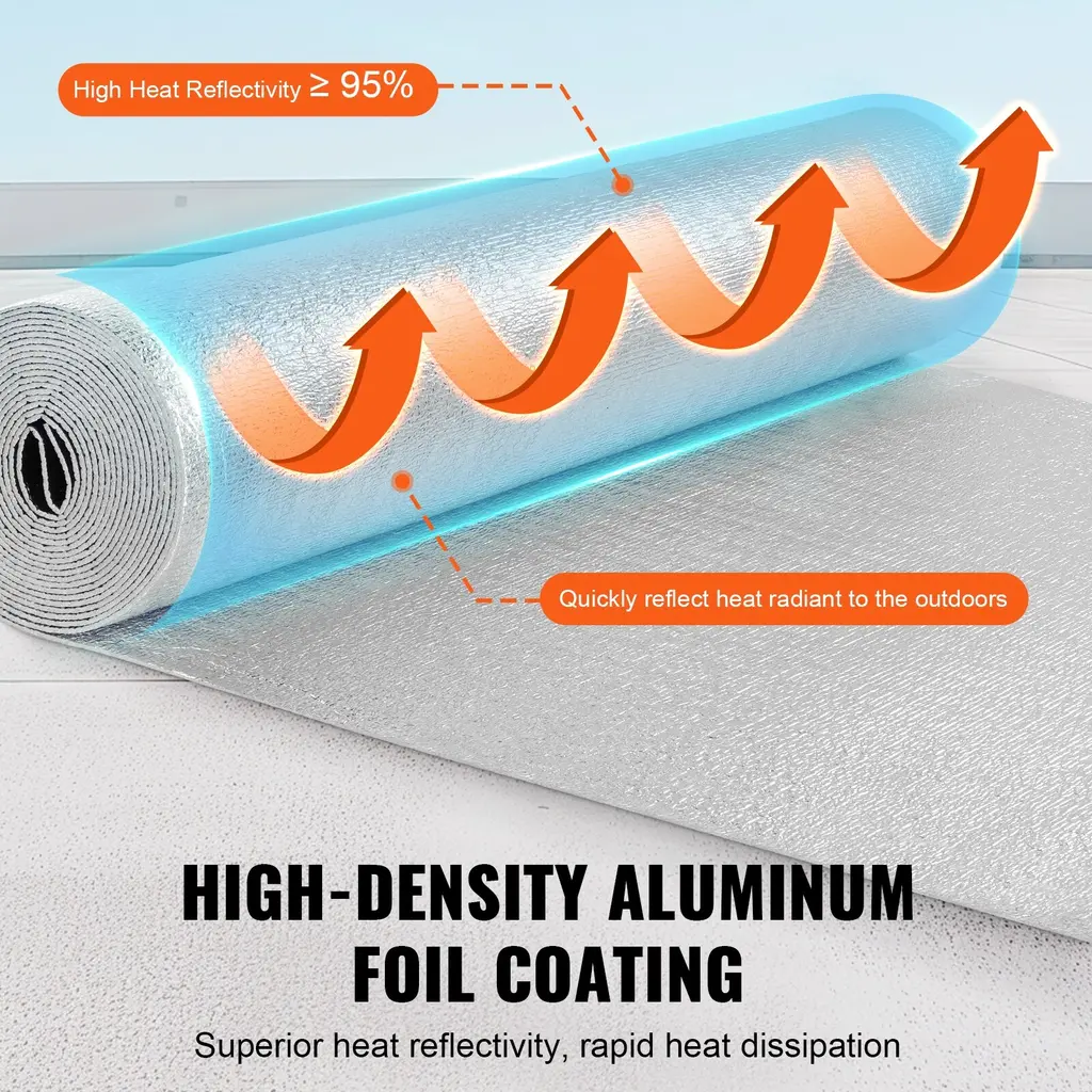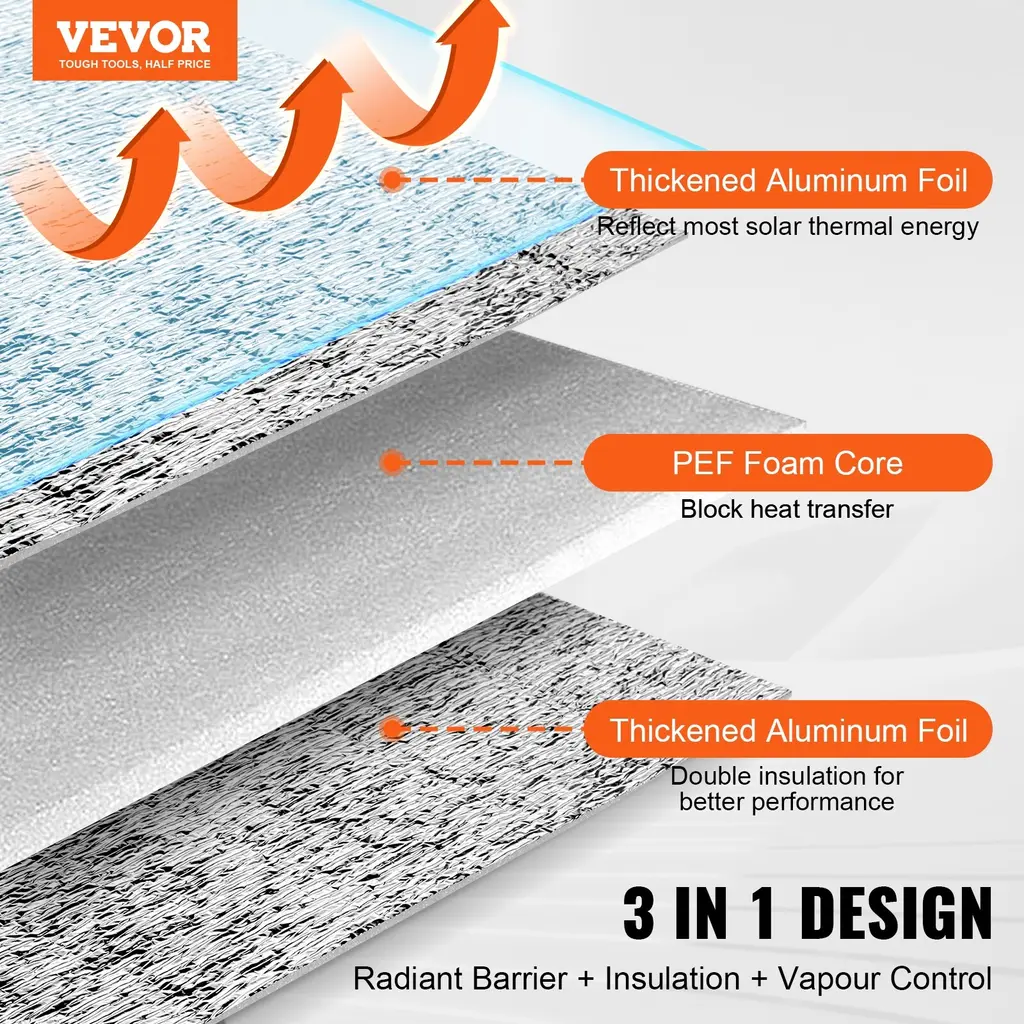 3-in-1 Design: VEVOR 25 ft x 24 in、50 ft x 48 in、50 ft x 23.8 in、10 ft x 48 in、25 ft x 48 in、100 ft x 48 in double reflective insulation roll features a versatile 3-in-1 design: Radiant Barrier + Insulation + Vapour Control, ensuring exceptional thermal performance. Excellent radiant barrier keeps you cool in summer and warm in winter, maintaining a comfortable indoor temperature year-round. Premium Materials: Crafted from double reflective aluminum foil and high-density EPE foam core, our 3.2 mm thick heat reflective insulation roll efficiently reflects sunlight and blocks heat transfer in summer, while preventing indoor heating loss in winter. Stay cool in summer, keep warm in winter ! Reflects Over 95% of Heat: Featuring high-density aluminum foil coating with outstanding heat reflectivity, this double reflective foam core radiant barrier efficiently reflects more than 95% of solar heat. Experience rapid heat dissipation, keeping your space cool and comfortable during hot days. Easy Installation: This double-sided aluminum foil insulation roll is easy to cut and install. It is convenient to DIY the roll size and shape to meet your different needs. When not in use, it can be easily folded up for space-saving and convenient carrying. Versatile Applications: Our thermal insulation heat shield is tear and puncture-resistant, scratch and wear-resistant, strong and lightweight. It's perfect for windows, garage doors, RVs, houses, roofs, etc, offering effective heat blocking and insulation wherever needed. Package Content 1 x Double Reflective Insulation Roll