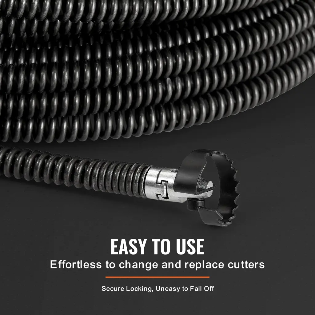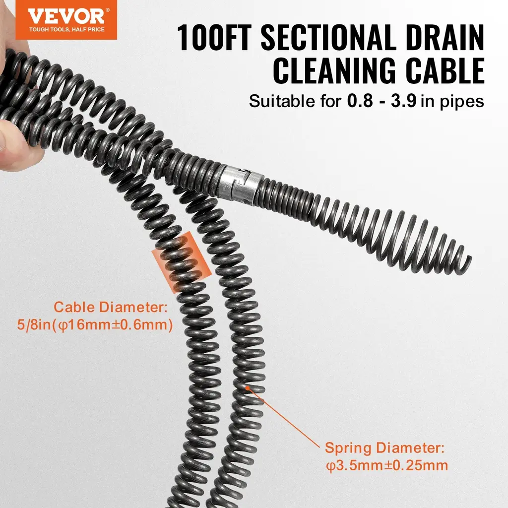 Professional Drain Cleaning Cable:For option 60 FT x 1-1/5 Inch:VEVOR sectional drain cleaning cable, measuring 60ft in total length with a steel wire diameter of 1-1/5in and a spring diameter of φ5mm, offers unmatched assistance for unclogging pipes ranging from 2.0 to 7.9 inches in diameter.For option 100 FT x 5/8 Inch:VEVOR sectional drain cleaning cable, measuring 100ft in total length with a steel wire diameter of 5/8in and a spring diameter of φ3.5mm, offers unmatched assistance for unclogging pipes ranging from 0.8 to 3.9 inches in diameter.For option 66 FT x 5/8 Inch: VEVOR sectional drain cleaning cable, measuring 66ft in total length with a steel wire diameter of 5/8in and a spring diameter of φ3.5mm, offers unmatched assistance for unclogging pipes ranging from 0.8 to 3.9 inches in diameter.For option 45 FT x 7/8 Inch: VEVOR sectional drain cleaning cable, measuring 45ft in total length with a steel wire diameter of 7/8in and a spring diameter of φ4mm, offers unmatched assistance for unclogging pipes ranging from 0.8 to 5.9 inches in diameter. Durable Spring Steel Material: Crafted from high-quality spring steel, this hollow core drain cable provides exceptional flexibility and high tensile strength. Resistant to tangling and breakage, it effortlessly navigates through multiple 90° bends, effectively tackling pipe obstructions. Easy Installation: Featuring a female slotted end, the sink drain snake cable effortlessly accommodates blade holders, allowing you to seamlessly replace cables in your drain machine. Plus, the safety lock ensures blades stay securely in place during operation. Versatile Applications: With 6 or 7different cutters included, this sink sectional cable excels in clearing various blockages, making it ideal for professional drain cleaning tasks. From unclogging toilets to sinks and floor drains, it offers versatile applications in homes, offices, and public spaces. Wide Compatibility: Our hollow core sewer cleaner cable is compatible with 1-1/5-inch and 1-1/4-inch diameter sectional drain cleaners. Save on costly plumbing services by tackling drain issues yourself ! Package Content 6 x Cutter 1 x Installation Tool
