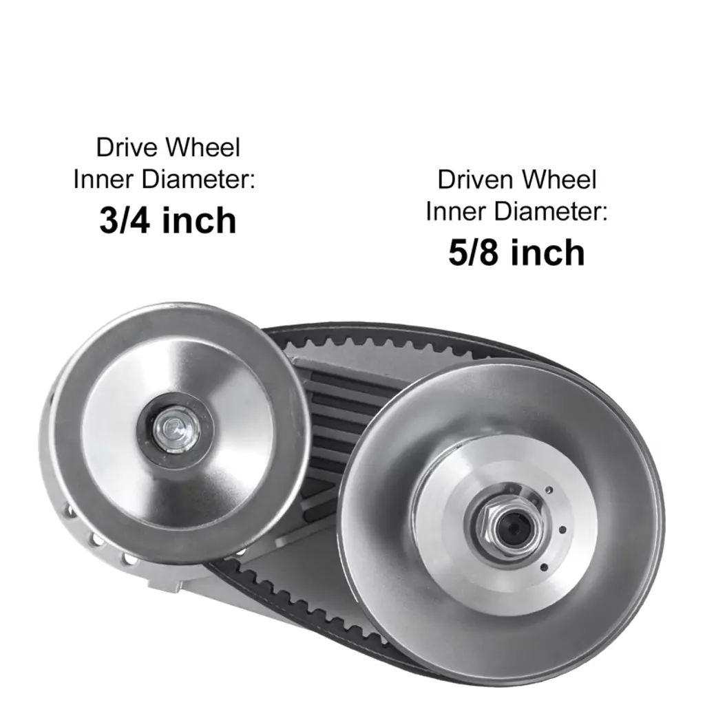 Feature: 30 Series Clutch Kit: Drive wheel inner diameter: 3/4 inch, driven wheel inner diameter: 5/8 inch. Compatible with replacement part numbers: 218353A,219552A,219456A,218352A. Compatible with 2-8 HP Engines: This kit fits go-karts, mini bikes, ATVs, UTVs, lawnmowers, generators, and more. Note: Ensure your engine is either American or Metric before installation and the appropriate bolts is not included. Enhanced Performance with Asymmetrical Design: The asymmetrical design of the drive and driven wheels boosts your vehicle's power, enhances torque transfer, enables efficient operation, and allows for quick engine start/stop, lowering fuel consumption. High-Tooth Count Belt: The widened, high-tensile rubber belt is designed for long-lasting durability, wear & break-resistance. With deeper, more numerous teeth, it provides a stronger grip, ensuring stable engagement with the drive and driven wheels at various speeds. Heavy-Duty Alloy Construction: The drive and driven wheels are made from iron and zinc alloy, featuring a rust-resistant coating. This heavy-duty, durable design offers good heat dissipation, and corrosion-resistant. Package Content 1 x Driver Belt 1 x Mounting Hardware 1 x 10T Sprocket 1 x 12T Sprocket 1 x Plastic Cover 1 x Mounting Plate 1 x User Manual 1 x Bolt Holder 1 x 1" Driver Pulley 1 x 5/8" Driver Pulley