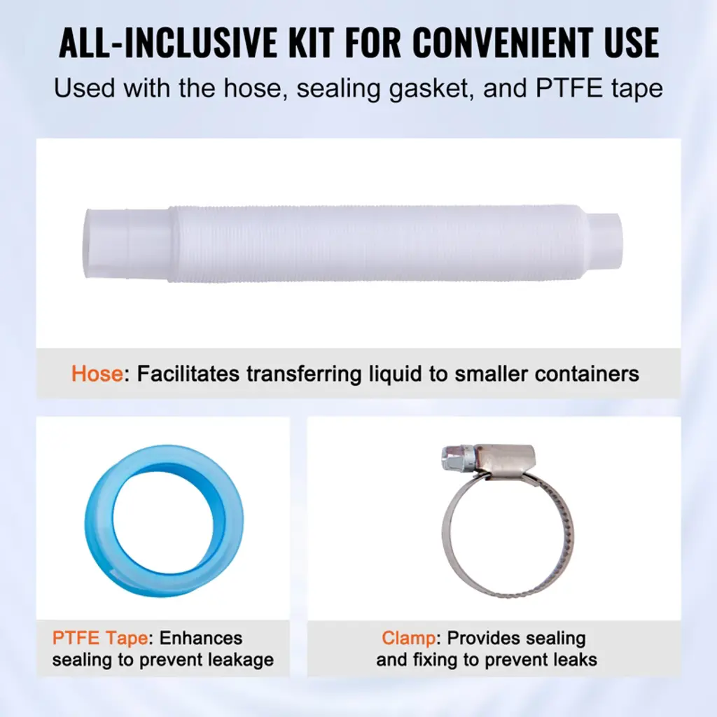 Feature: Supercharge Your Extraction: Pump with gusto! Our drum pump delivers 6.5 gallons per minute, ensuring your liquids - be it water, alcohol, antifreeze, DEF, or corrosive liquids - zip right out. Just remember, our pump prefers not to mingle with diesel, kerosene, engine oil, or gasoline. Simplicity at Its Best: Toss aside those operation manuals! Our barrel pump features an ergonomic handle that fits comfortably in your hand, ensuring a non-slip grip. With a rotary hand crank, you’ll have those liquids transferred before you know it. Fits Like a Glove: Fear not about sizes! This hand pump sports a 2" NPT universal threading and a 3-section suction tube (outer diameter: 1"/25 mm, total length: 40.2"/1020 mm). Whether your drum's 5 gallons or a whopping 55, we've got you covered. Durability You Can Trust: This isn't just a pump; it's an investment. Crafted from high-strength PP plastic, this 55 gallon barrel pump laughs in the face of wear and impact. Get ready for a long and prosperous pumping journey. An Ensemble of Extras: No more surprise trips to the hardware store. Our pail pump comes with a hose, hose clamp, and PTFE tape, ensuring an airtight seal to prevent any pesky leaks. All you need for a smooth and seamless liquid transfer experience. Package Content 1 x Drum Pump 1 x Hose 1 x Clamp 1 x PTFE Tape
