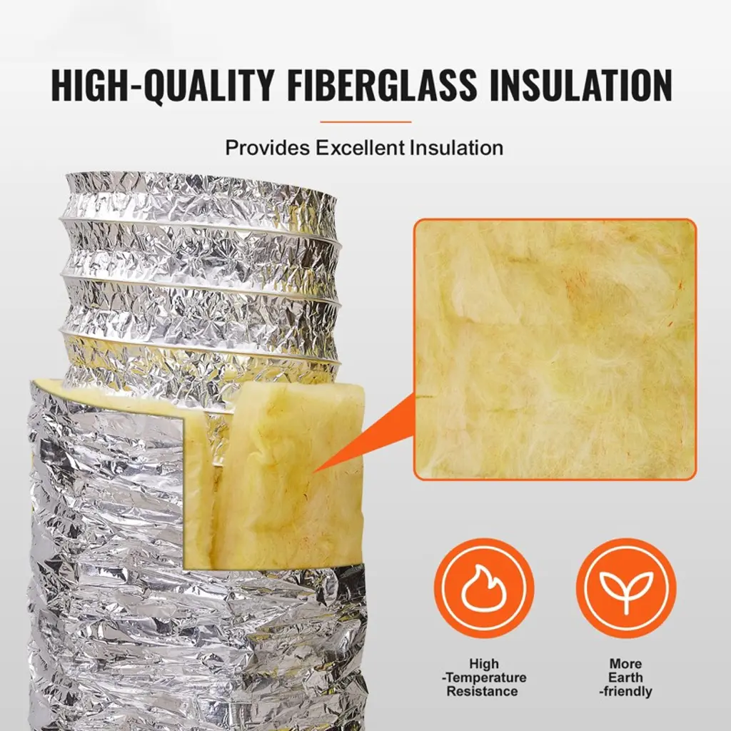 Feature: Efficient Insulation: Enhance Comfort with High-Loft Glass Fiber Insulation, Quieting Operation and Reducing Heat Transfer. High-Quality Insulation Cotton: Utilizing high-loft Owens Corning insulation cotton, it reduces heat conduction while absorbing noise generated during operation, enhancing user comfort. 3-Layer Tough: Built to Last with Durable Single-Sided Aluminum Foil and PET, Reinforced with Fiberglass Grid for Safety and Longevity, Achieving an R-4.2 Flame Resistance Rating. Flexible and Easy to Use: Can be bent, compressed, or cut as needed for installation without affecting the interior of the duct, reducing air resistance and improving installation adaptability. Variety of Applications: Primarily used for temperature control, dehumidification, and ventilation needs in various settings such as central air conditioning, fresh air systems, and greenhouse tents. Package Content Flexible Duct x 1 Stainless Steel Clamps x 2