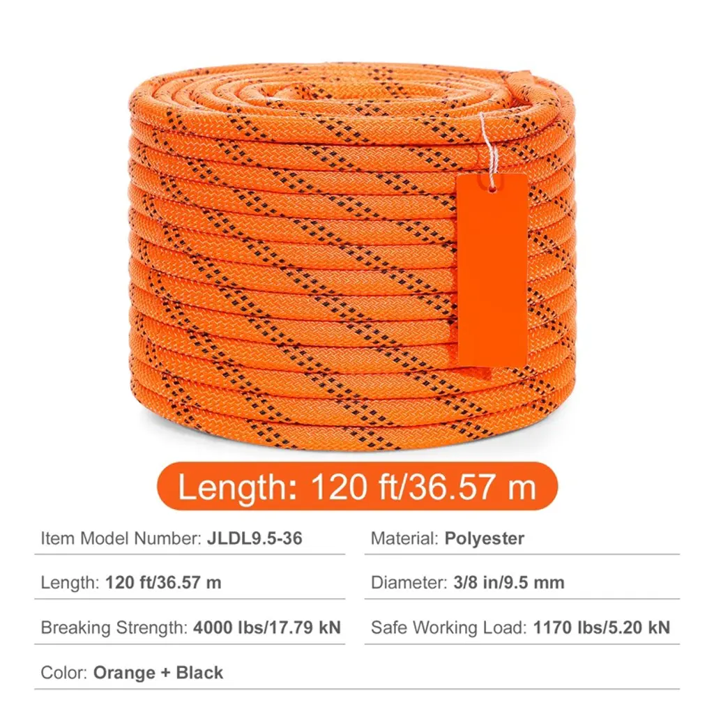 Feature: High Strength Rope: VEVOR 3/8 inch diameter double braided polyester rope comes with a breaking strength of 4000 LBS/17.79kN and 120 ft/36.57 m in length. The quality is tough and reliable to handle various professional tasks as per what you need. Double Braided Construction: Our climbing rope features a double-braided design, with the combination of the high-strength polyester with a twisted inner core. It's tough enough to handle any job, yet flexible and easy to knot. Say goodbye to fraying! 10% Length Increase: With a 10% increase in length, our outdoor climbing rope now reaches an impressive 120 ft/36.57 m. That's as tall as a 12-story building! Perfect for all your daily aerial work needs, whether it's home projects or outdoor adventures. 4000 LBS/17.79kN Breaking Strength: VEVOR 3/8" polyester rope performs an outstanding pulling strength. It's suggested to work within 1170 LBS and handle up to 4000 LBS at its breaking strength; this ensures the maximum level of security during rope operations. Heat-Fused Cutting and Sealing: Our arborist rigging rope is finished with heat-sealed ends, ensuring durability and security with every use. No more worries about fraying or unraveling – just reliable performance every time. Package Content 1 x Polyester Rope