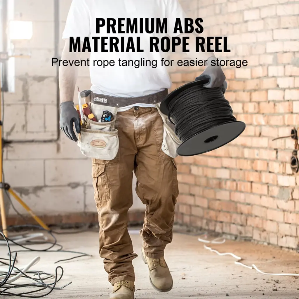 Feature: High Strength Rope: VEVOR 3/16 inch diameter braided nylon rope comes with a breaking strength of 720 LBS/3.20kN and 1000 ft/304.8 m in length. The quality is tough and reliable to handle various professional tasks as per what you need. Braided Construction: Our climbing rope features a braided design, with the combination of the high-strength nylon with a twisted inner core. It's tough enough to handle any job, yet flexible and easy to knot. Say goodbye to fraying! 1000 ft/304.8 m Length: Our outdoor climbing rope reaches an impressive length of 1000 ft/304.8 m. That's as tall as a 100-story building! Perfect for all your daily aerial work needs, whether it's home projects or outdoor adventures. 720 LBS/3.20kN Breaking Strength: VEVOR 3/16" nylon rope performs an outstanding pulling strength. It's suggested to work within 220 LBS and handle up to 720 LBS at its breaking strength; this ensures the maximum level of security during rope operations. ABS Rope Reel: Our arborist rigging rope comes with a high-quality ABS rope reel, so say goodbye to tangled messes and hello to hassle-free storage! Package Content 1 x Polyester Rope