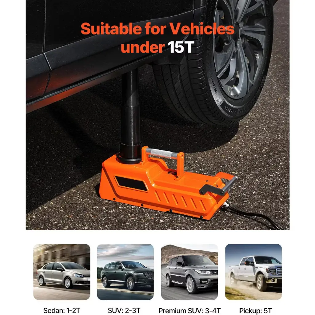 Feature: For 15T Vehicles: This electric jack is designed for hydraulic lifting of single tires on vehicles up to 15T, making it easy to reach for cars, SUVs, and more. Note: The jack must be used on a flat surface and positioned vertically with your vehicle. Wider Lifting Range: Hydraulic lifting range: 7.9-20.5 in/200-520 mm, equipped with a wired remote control for easy adjustment of the desired height. It is more convenient, allowing you to easily access vehicles with varying ground clearance, making tire changes quicker. Dual Power Supply: Equipped with a cigarette lighter and 12V car power clamp for flexible power options. For vehicles over 5T, we recommend using the car power supply to ensure stable lifting. 3 spare fuses included to avoid fuse burnout. Security Assurance: The top head is designed with a non-slip texture to securely hold the vehicle, ensuring it stays in place during lifting and lowering. This provides enhanced stability and security for the user. For your safety, do not work under the vehicle while it is raised. Lighting: Our jack comes with bright lighting, illuminating the area around the vehicle. This ensures you can change tires securely at night without fumbling in the dark. It also doubles as emergency lighting, providing extra convenience and peace of mind in low-light situations. Package Content 1 x Hydraulic Jack (with Cigarette Lighter Power Cord) 4 x Fuses (1 pre-installed in cigarette lighter plug) 1 x Power Clamp 1 x Wrench 1 x Pair of Gloves 1 x User Manual