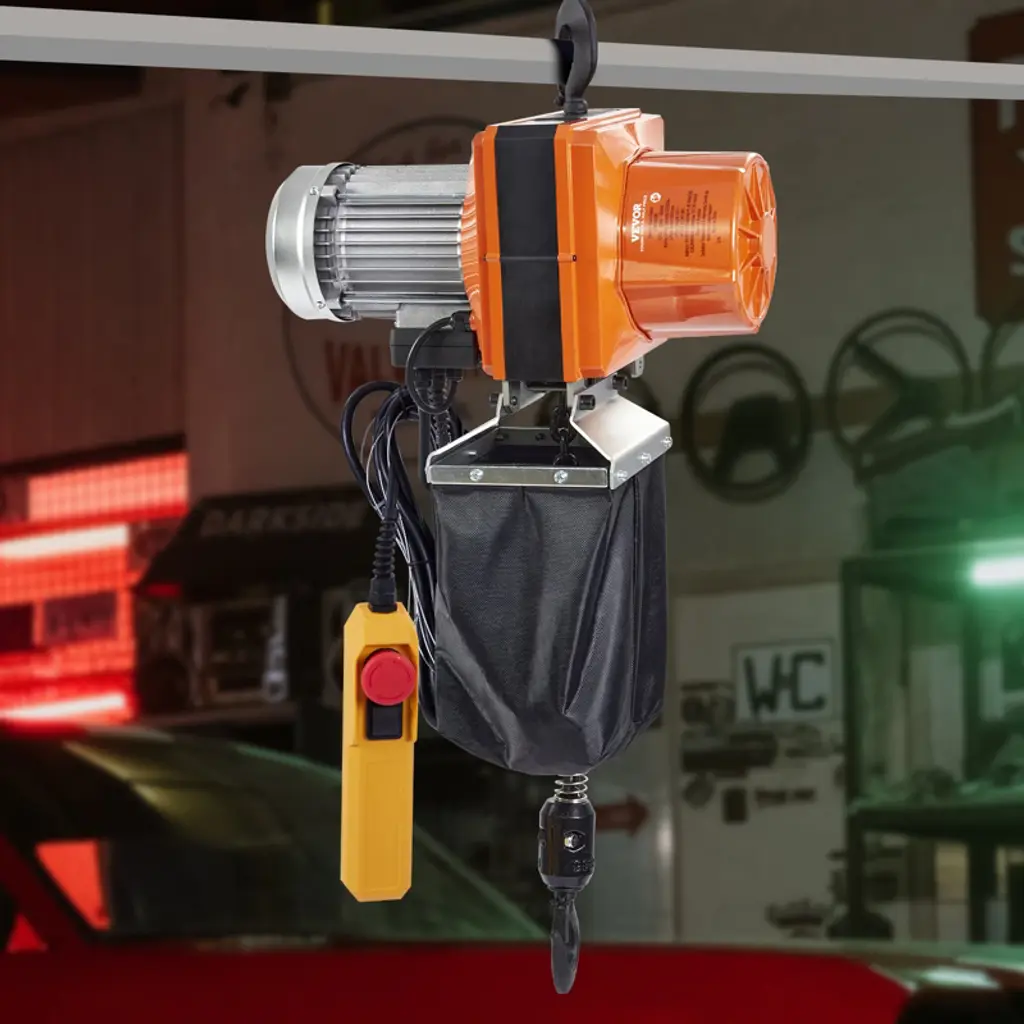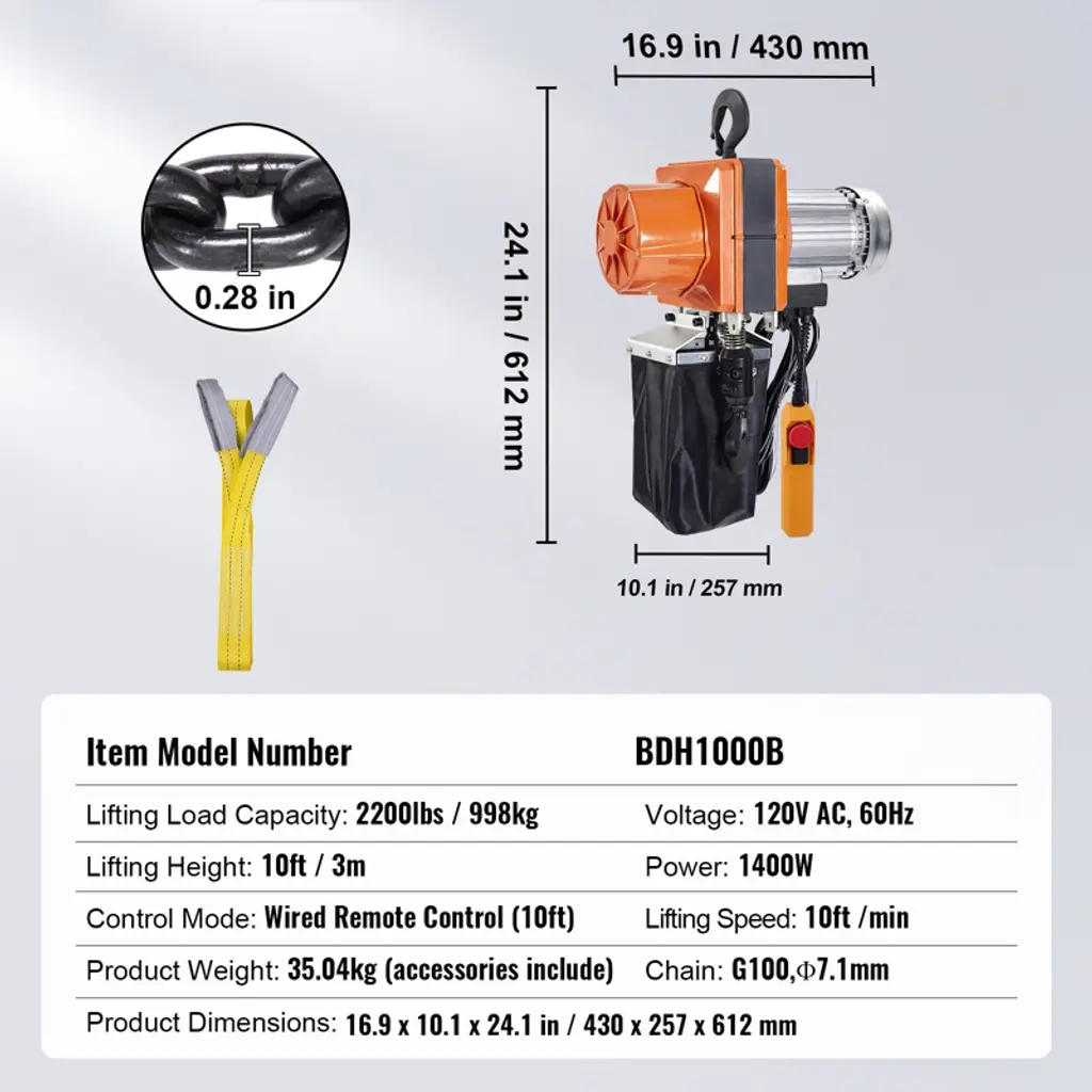 Electric Chain Hoist, 2200 lbs/1 ton Capacity, 10 ft Lifting Height, 10 ft/min Speed, 120V, Single Phase Overhead Crane with G100 Chain, 10 ft Wired Remote Control for Garage, Shop, Hotel, Home Feature: 2200 lbs Load Capacity: Our electric chain hoist is equipped with a G100 chain to provide a safe lifting capacity of 2200 lbs/1 ton. It can lift all kinds of heavy objects at a speed of 10 ft/min (3 m/min) with a maximum lifting height of 10 ft/3 m. Powerful Motor: The copper motor provides 1400W of power to handle heavy loads without deformation. The large radiator fan keeps the electric chain fall hoist cool to avoid overheating. All these features ensure efficient work and save you more time and energy. Install in No Time: Our overhead electric hoist is easy to install and can be directly hung on the ceiling with metal strips or solid wood strips. It has an emergency stop switch and an electromagnetic brake system to prevent abnormal slipping. Extended Control Cable: The wired remote control of our electric hoist is realized through the handle switch installed on the machine by the cable. The length of the extended cable is 10 ft/3 m, allowing you to operate at a safe distance. Use It Anywhere: Our overhead crane is suitable for garages, shops, hotels, and homes, perfect for both professionals and hobbyists. It is great for boat repair, autos, mowers, golf carts, home decorations, engines, boulders, trees, etc. It is an ideal helper for lifting machinery and also convenient for hunters to hang their prey. Package Content: 1 x Electric Chain Hoist 1 x Strap