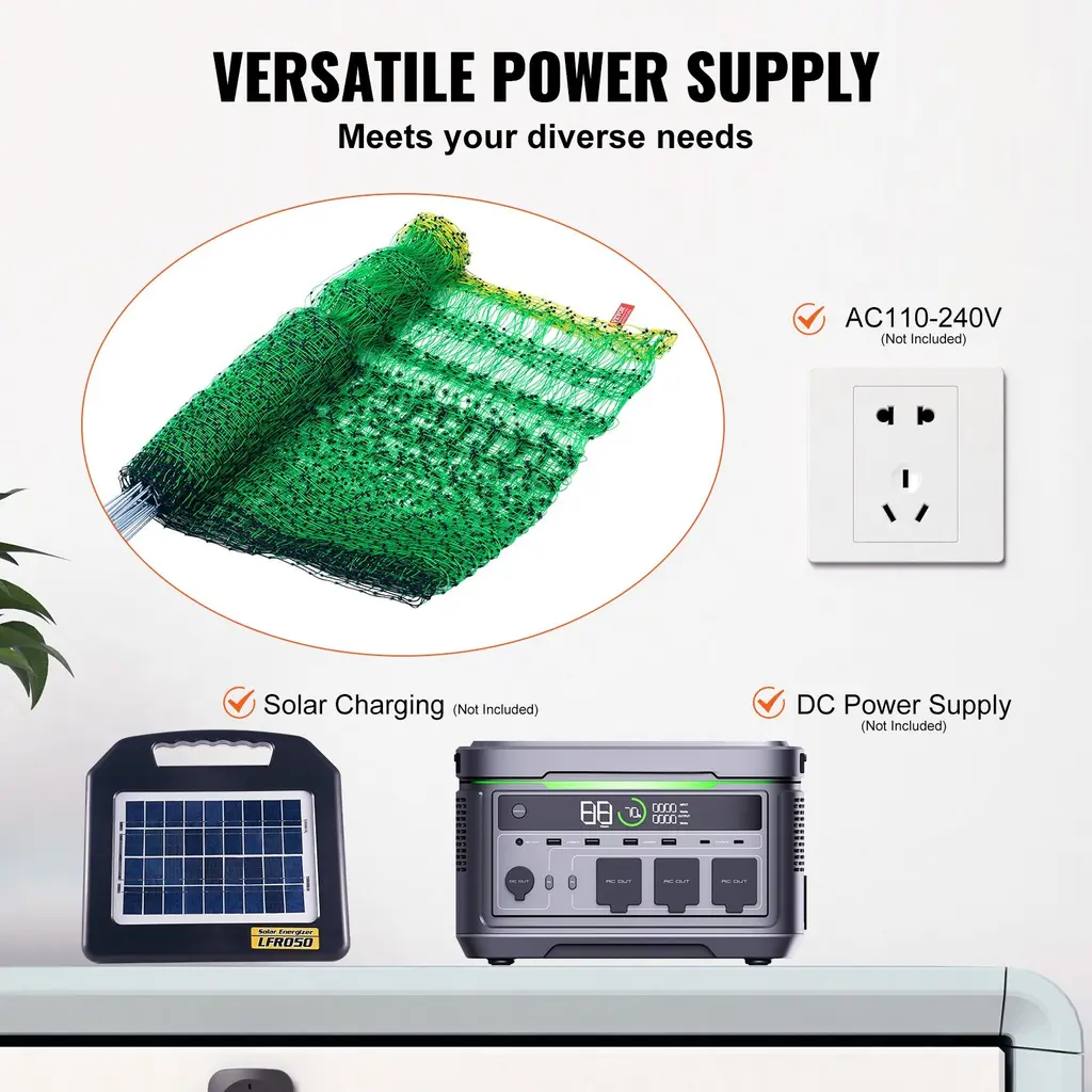 Comprehensive Size Design: For 35" H x 164' L option, the electric fence netting is meticulously designed in a large size of 35 in x 164 ft/0.88 x 49.98 m; for 42" H x 164' L option, size of 42 in x 164 ft/1.06 x 49.98 m; for 50" H x 164' L option, size of 50 in x 164 ft/1.27 x 49.98 m, combined with scientifically spaced grids, ensuring a solid enclosure for animals of all sizes. Each double-spiked stake and fiberglass post is precisely spaced, providing the strongest fence stability. Sturdy and Durable: Our electric netting withstands the test of weather, with the combination of windproof kits and solid fiberglass posts ensuring long-term durability. The included warning sign and repair kit make maintenance easier, keeping it as good as new for a prolonged period. Wide Applicability: Whether it's sheep, deer, hogs, or dogs, this electric netting fence is suitable for various large livestock, providing comprehensive protection for your farm. Effective Electric Current: The electric net fence precisely controls the intensity of the electric current, effectively protecting without harming animals. It ensures the security of your poultry and livestock while maintaining long-term protection of the fence. Multiple Power Supply Options: This electric fence supports external power supply of AC110-240V, as well as solar panels and DC power supply (not included). These multiple power supply options reduce energy consumption and provide a green solution for your farm. Package Content 1 x Electric Fence Netting 1 x Plastic Warning Sign 1 x Repair Kit 2 x Windproof Kits