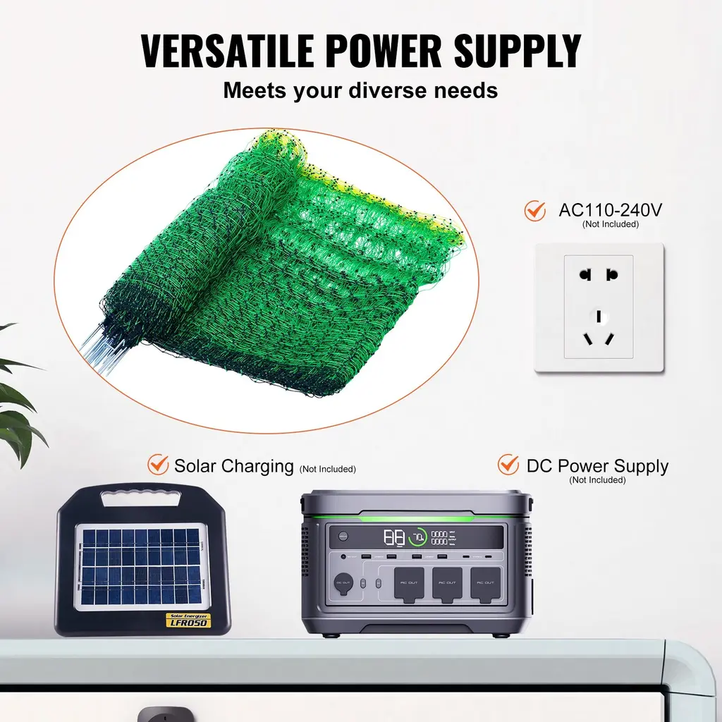 Comprehensive Size Design: For 35" H x 164' L option, the electric fence netting is meticulously designed in a large size of 35 in x 164 ft/0.88 x 49.98 m; for 42" H x 164' L option, size of 42 in x 164 ft/1.06 x 49.98 m; for 50" H x 164' L option, size of 50 in x 164 ft/1.27 x 49.98 m, combined with scientifically spaced grids, ensuring a solid enclosure for animals of all sizes. Each double-spiked stake and fiberglass post is precisely spaced, providing the strongest fence stability. Sturdy and Durable: Our electric netting withstands the test of weather, with the combination of windproof kits and solid fiberglass posts ensuring long-term durability. The included warning sign and repair kit make maintenance easier, keeping it as good as new for a prolonged period. Wide Applicability: Whether it's sheep, deer, hogs, or dogs, this electric netting fence is suitable for various large livestock, providing comprehensive protection for your farm. Effective Electric Current: The electric net fence precisely controls the intensity of the electric current, effectively protecting without harming animals. It ensures the security of your poultry and livestock while maintaining long-term protection of the fence. Multiple Power Supply Options: This electric fence supports external power supply of AC110-240V, as well as solar panels and DC power supply (not included). These multiple power supply options reduce energy consumption and provide a green solution for your farm. Package Content 1 x Electric Fence Netting 1 x Plastic Warning Sign 1 x Repair Kit 2 x Windproof Kits
