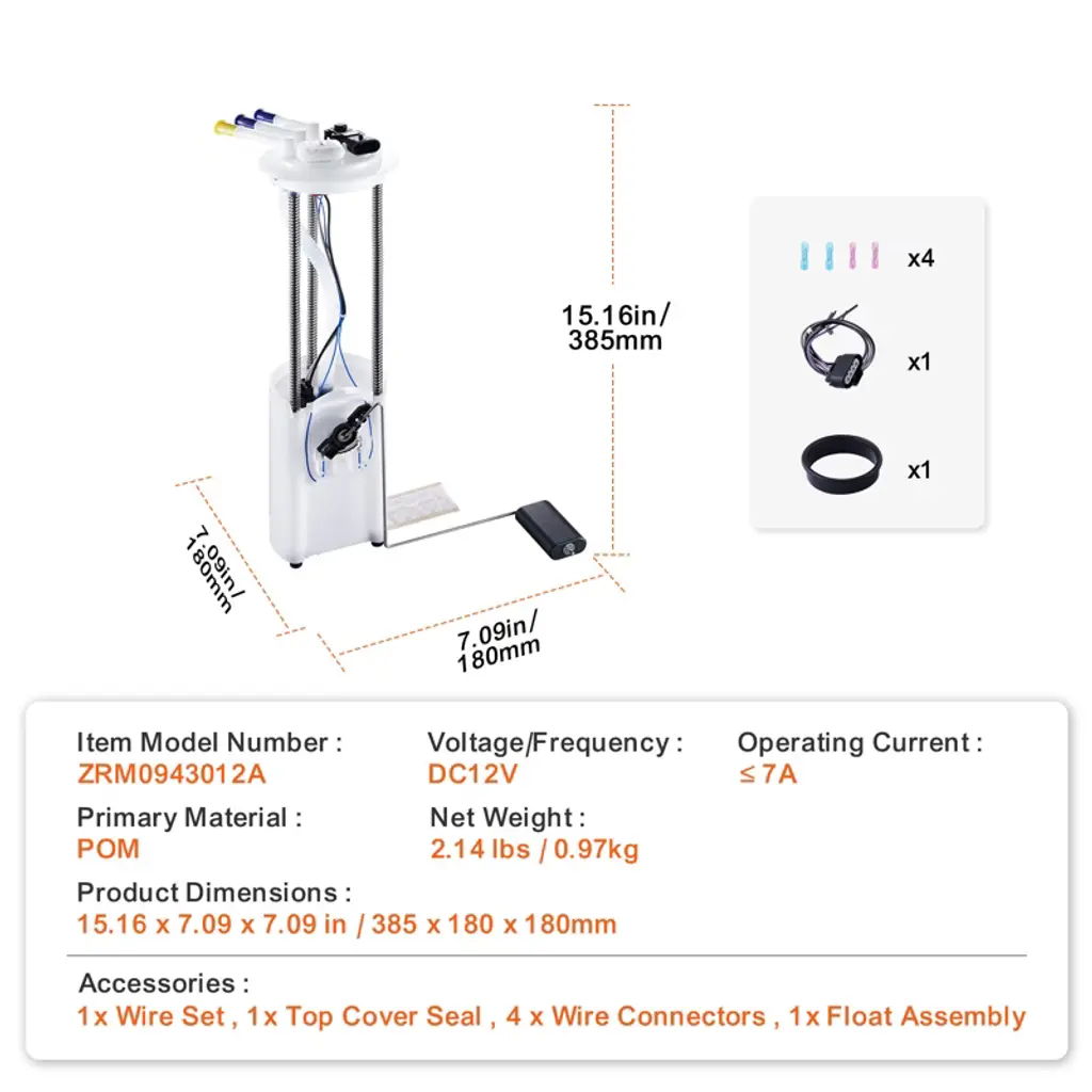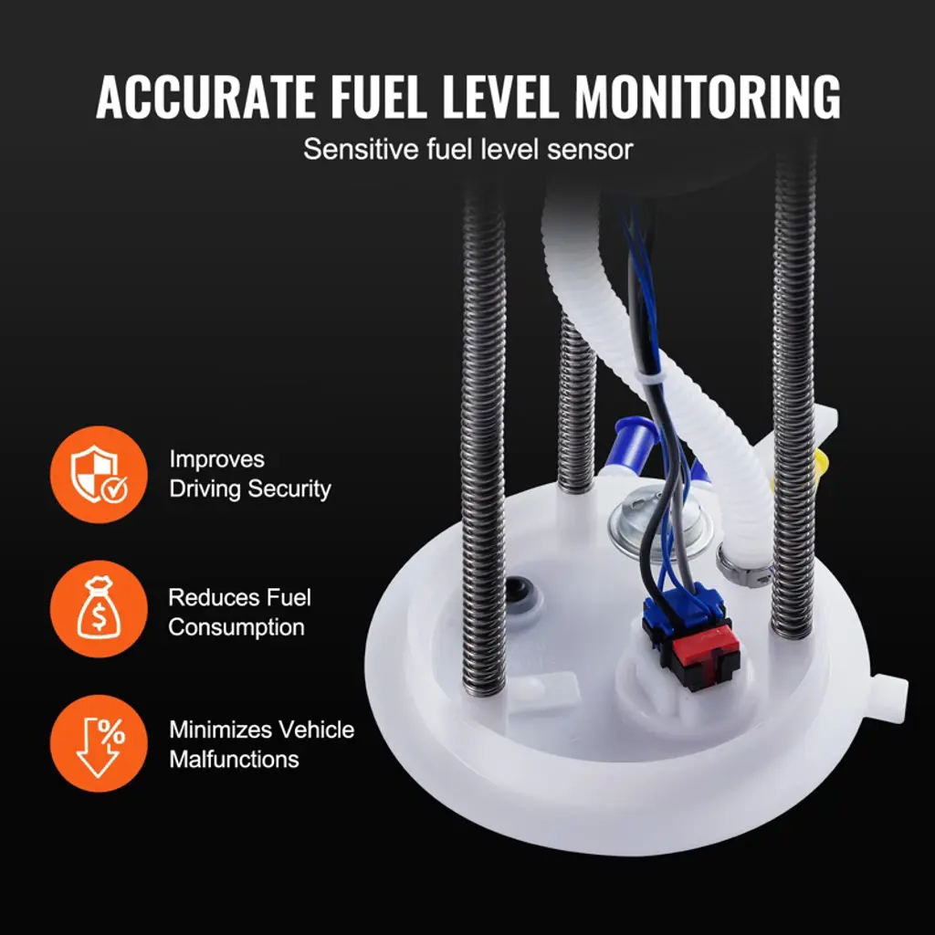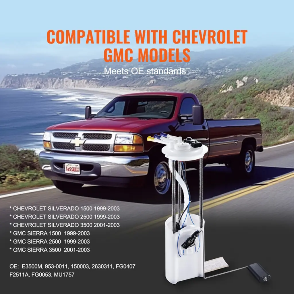 Feature: Wide Compatibility: Our fuel pump module assembly is compatible with the following models: Chevrolet Silverado 1500 1999-2003, Chevrolet Silverado 2500 1999-2003, Chevrolet Silverado 3500 2001-2003; GMC Sierra 1500 1999-2003, GMC Sierra 2500 1999-2003, GMC Sierra 3500 2001-2003. Meets OE Standards: This fuel pump assembly is engineered to meet OE standards for safety and reliability. Reference OE numbers: E3500M, 953-0011, 150003, 2630311, FG0407, F2511A, FG0053, MU1757. High Efficiency & Stability: This fuel pump assembly replacement operates at 3 Bar pressure with a flow rate of ≥180 L/h, ensuring efficient and stable fuel atomization. With a noise level ≤ 48dB, it offers smooth, quiet performance while optimizing fuel delivery for enhanced engine performance. Leak Prevention Design: Equipped with corrugated tubing and clamps to handle pressure changes, the electric fuel pump assembly effectively prevents pipe bursts and detachment, making maintenance easy. Complete Accessories: The fuel pump module is built to match original parts, ensuring a secure seal for easy installation and preventing fuel leaks, safeguarding your driving safety and fuel system stability. Package Content: 1 x Fuel Pump Module Assembly 1 x Wire Set 1 x Top Cover Seal 4 x Wire Connectors 1 x Float Assembly