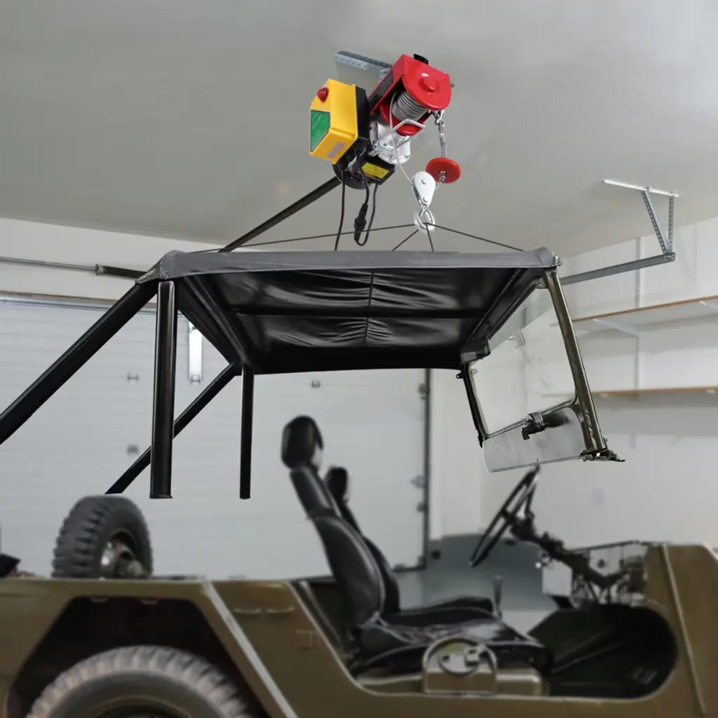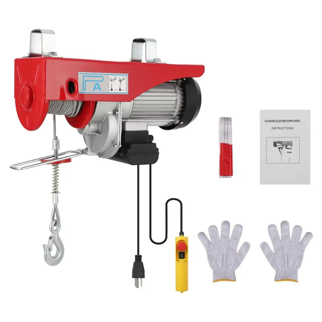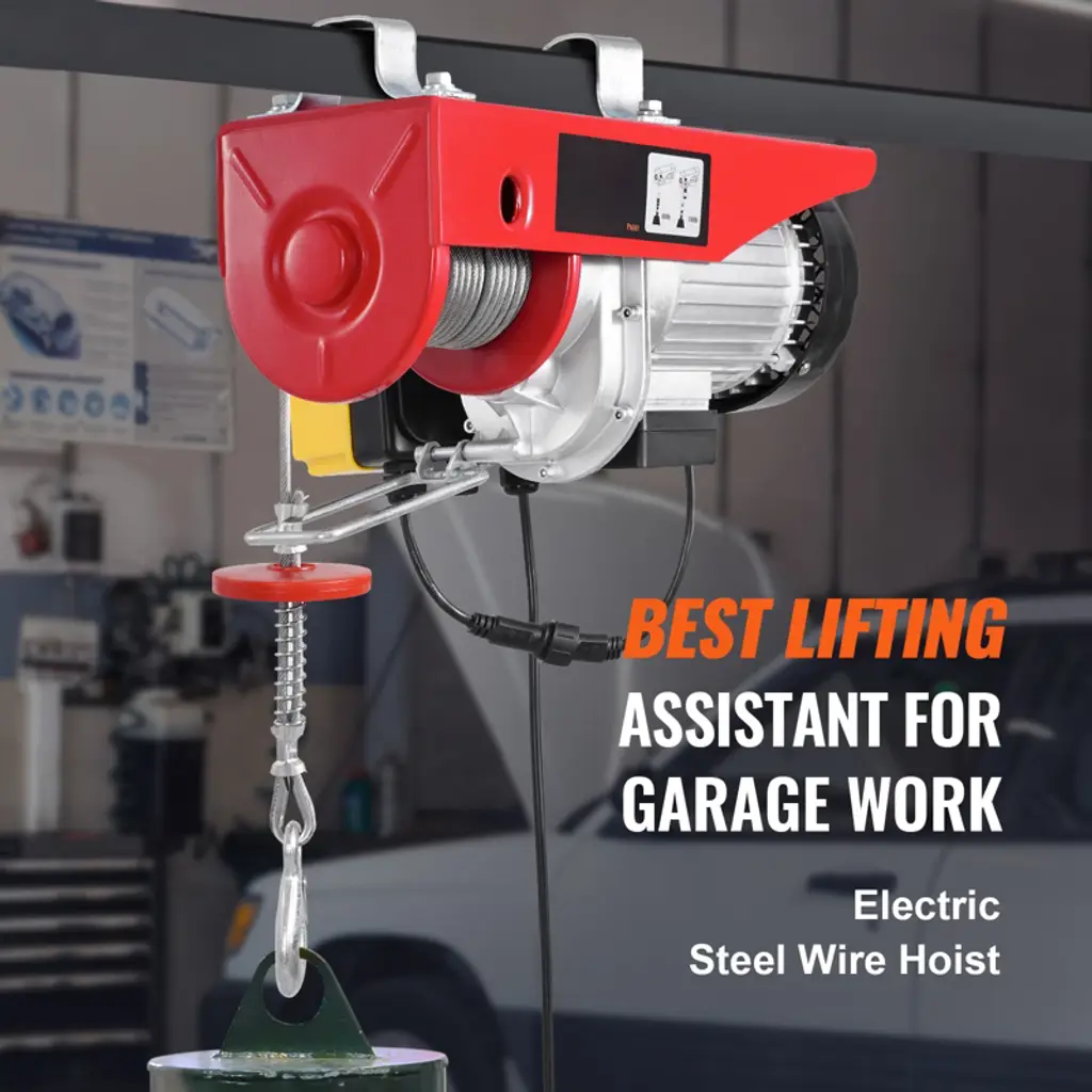 Feature: 1760 lbs Load Capacity: This electric hoist can easily lift small engines, transmissions, large workshop tools, or construction supplies. Lifting Load Capacity: 880 lbs/400 kg (Single Cable), 1760 lbs/800 kg (Double Cable). Powerful Motor: The high-quality copper motor provides strong power, which can withstand large forces without causing deformation of the electric winch. In addition, the large cooling fan can quickly cool the machine to avoid overheating. Therefore, this powerful motor ensures efficient operation and saves you more time and energy. Convenient to Install: Our garage hoist can be directly hung on the ceiling using metal or solid wooden strips. Moreover, it is equipped with an emergency stop switch and an electromagnetic braking system to avoid abnormal sliding. Wireless Remote Control: Our ceiling lift is equipped with a wireless remote control. The maximum control distance is 328 ft/100 m. It provides a great switch function that allows one-handed operation of the electric hoist to lift, lower, and place the equipment. Multiple Uses: This electric cable hoist is widely used in garages, factories, warehouses, and families, as well as professionals and amateurs. It is suitable for repairing ships, cars, lawnmowers, golf carts, home decor, engines, boulders, trees, etc. Package Content 1 x Electric Hoist 1 x Accessory Kit